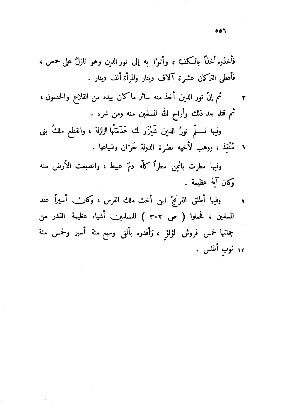 فأخذوه أخذا بالكفّ، وأتوا به إلى نور الدين وهو نازل على حمص، فأعطى التركمان عشرة آلاف دينار والمرأة ألف دينار.