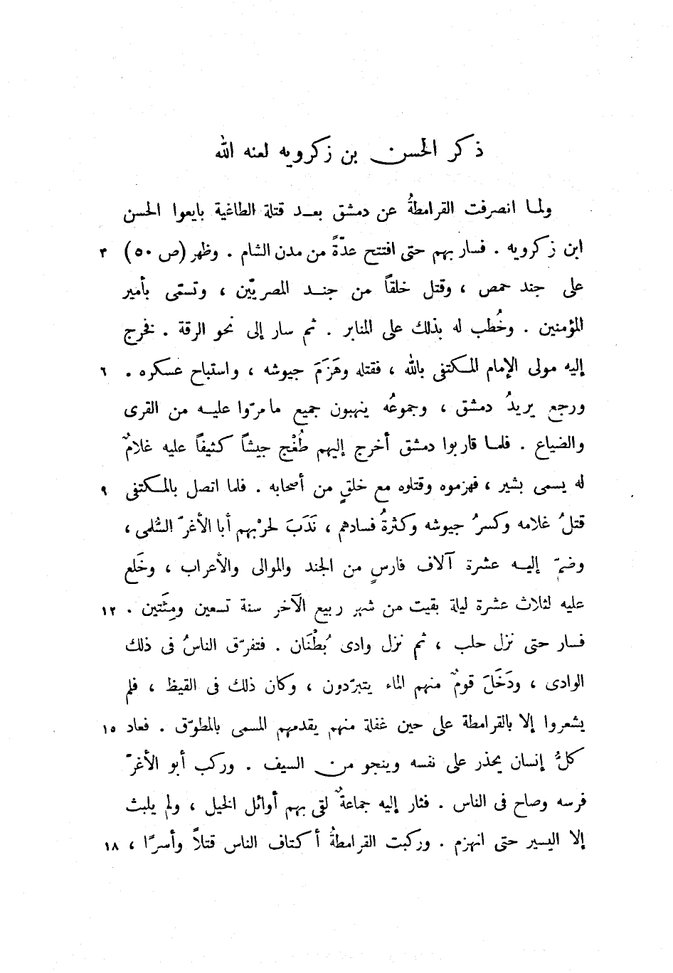 ولما انصرفت القرامطة عن دمشق بعد قتلة الطاغية بايعوا الحسن ابن زكرويه. فساربهم حتى افتتح عدّة من مدن الشام. وظهر (ص 50) على جند حمص، وقتل خلقا من جند المصرييّن، وتسمّى بأمير المؤمنين. وخطب له بذلك على المنابر. ثم سار إلى نحو الرقة. فخرج إليه مولى الإمام المكتفى بالله، فقتله وهزم جيوشه، واستباح عسكره.
