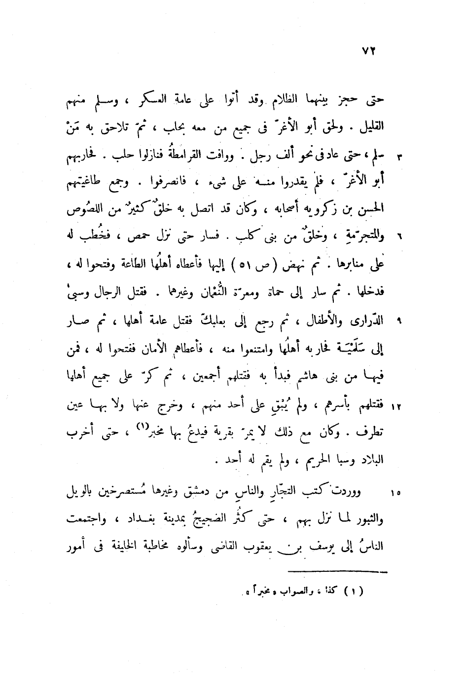 حتى حجز بينهما الظلام وقد أتوا على عامة العسكر، وسلم منهم القليل. ولحق أبو الأغرّ فى جميع من معه بحلب، ثمّ تلاحق به من سلم، حتى عاد فى نحو ألف رجل. ووافت القرامطة فنازلوا حلب. فحاربهم أبو الأغرّ، فلم يقدروا منه على شئ، فانصرفوا. وجمع طاغيتهم الحسن بن زكرويه أصحابه، وكان قد اتصل به خلق كثير من اللصوص والمتجرّمة، وخلق من بنى كلب. فسار حتى نزل حمص، فخطب له على منابرها. ثم نهض (ص 51) إليها فأعطاه أهلها الطاعة وفتحوا له، فدخلها. ثم سار إلى حماة ومعرّة النّعمان وغيرهما. فقتل الرجال وسبى الدّرارى والأطفال، ثم رجع إلى بعلبكّ فقتل عامة أهلها، ثم صار إلى سلمية فحاربه أهلها وامتنعوا منه، فأعطاهم الأمان ففتحوا له، فمن فيها من بنى هاشم فبدأ به فقتلهم أجمعين، ثم كرّ على جميع أهلها فقتلهم بأسرهم، ولم يبق على أحد منهم، وخرج عنها ولا بها عين تطرف. وكان مع ذلك لا يمرّ بقرية فيدع بها مخبر، حتى أخرب البلاد وسبا الحريم، ولم يقم له أحد.