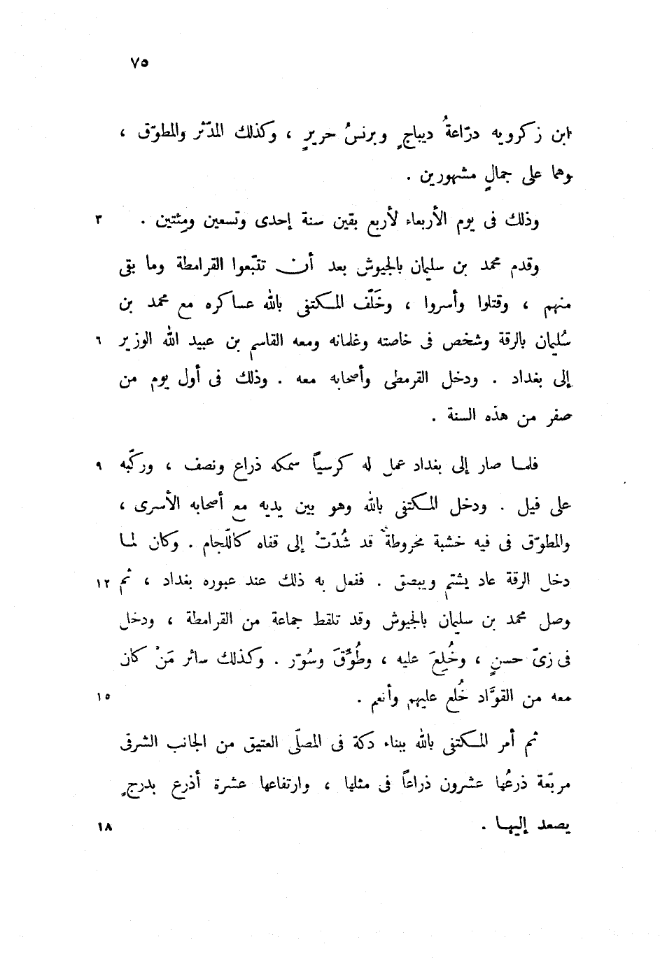 فلما صار إلى بغداد عمل له كرسيا سمكه ذراع ونصف، وركّبه على فيل. ودخل المكتفى بالله وهو بين يديه مع أصحابه الأسرى، والمطوّق فى فيه خشبة مخروطة قد شدّت إلى قفاه كالّلجام. وكان لما دخل الرقة عاد يشتم ويبصق. ففعل به ذلك عند عبوره بغداد، ثم وصل محمد بن سليمان بالجيوش وقد تلقط جماعة من القرامطة، ودخل فى زىّ حسن، وخلع عليه، وطوّق وسوّر. وكذلك سائر من كان معه من القوّاد خلع عليهم وأنعم.