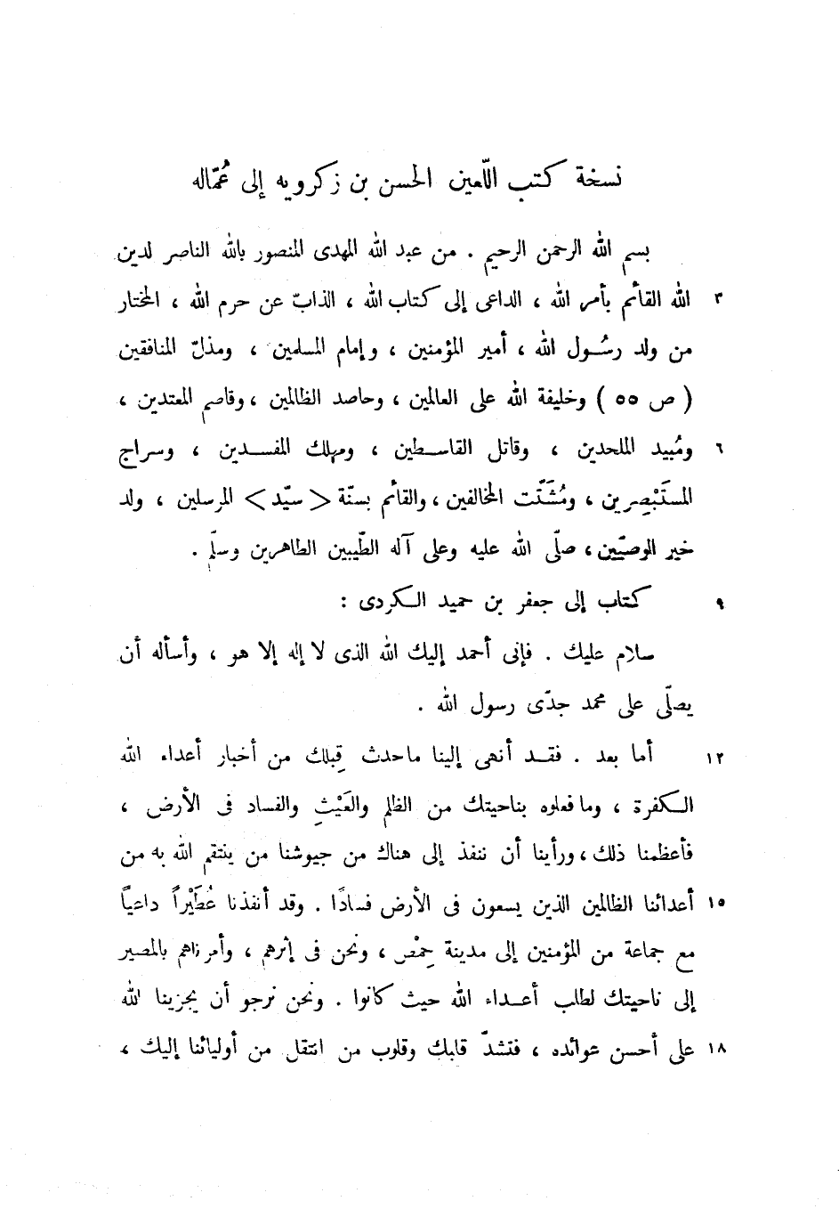 بسم الله الرحمن الرحيم. من عبد الله المهدى المنصور بالله الناصر لدين الله القائم بأمر الله، الداعى إلى كتاب الله، الذابّ عن حرم الله، المختار من ولد رسول الله، أمير المؤمنين، وإمام المسلمين، ومذلّ المنافقين (ص 55) وخليفة الله على العالمين، وحاصد الظالمين، وقاصم المعتدين، ومبيد الملحدين، وقاتل القاسطين، ومهلك المفسدين، وسراج المستبصرين، ومشتّت المخالفين، والقائم بسنّة <سيّد> المرسلين، ولد خير الوصييّن، صلّى الله عليه وعلى آله الطّيبين الطاهرين وسلّم.