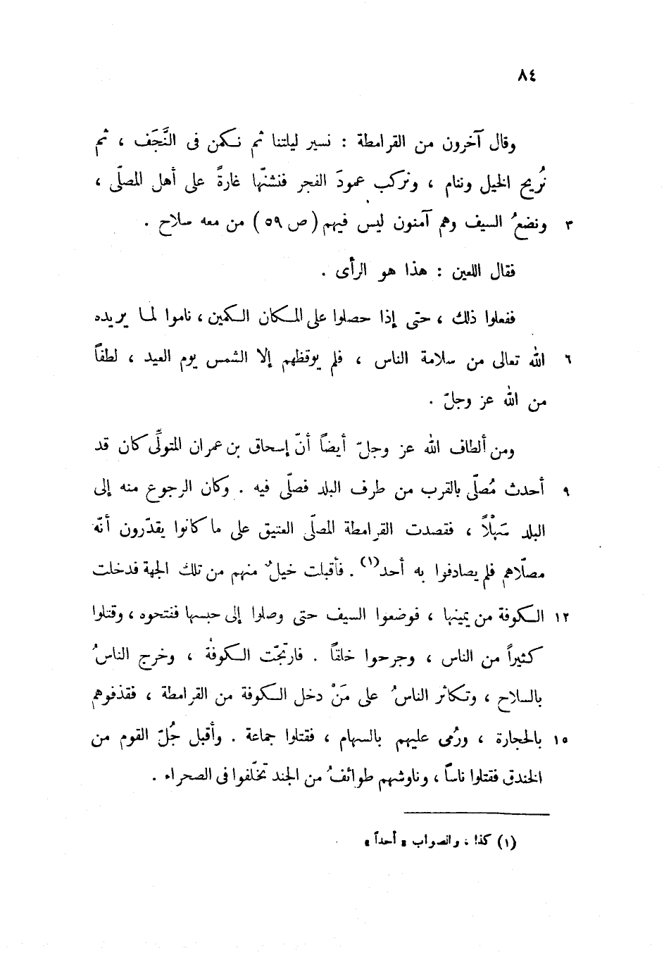 وقال آخرون من القرامطة: نسير ليلتنا ثم نكمن فى النّجف، ثم نريح الخيل وننام، ونركب عمود الفجر فنشنّها غارة على أهل المصلّى، ونضع السيف وهم آمنون ليس فيهم (ص 59) من معه سلاح.