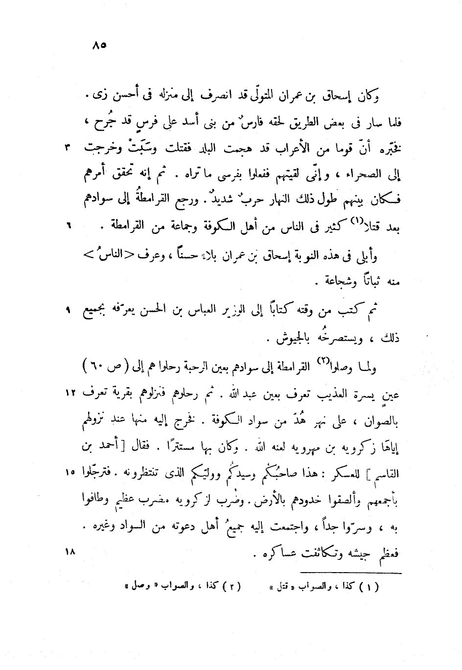 ولما وصلوا القرامطة إلى سوادهم بعين الرحبة رحلوا هم إلى (ص 60) عين يسرة العذيب تعرف بعين عبد الله. ثم رحلوهم فنزلوهم بقرية تعرف بالصوان، على نهر هدّ من سواد الكوفة. فخرج إليه منها عند نزولهم إياها زكرويه بن مهرويه لعنه الله. وكان بها مستترا. فقال [أحمد بن القاسم] للعسكر: هذا صاحبكم وسيدكم ووليّكم الذى تنتظرونه. فترجّلوا بأجمعهم وألصقوا خدودهم بالأرض. وضرب لزكرويه مضرب عظيم وطافوا به، وسرّوا جدا، واجتمعت إليه جميع أهل دعوته من السواد وغيره.