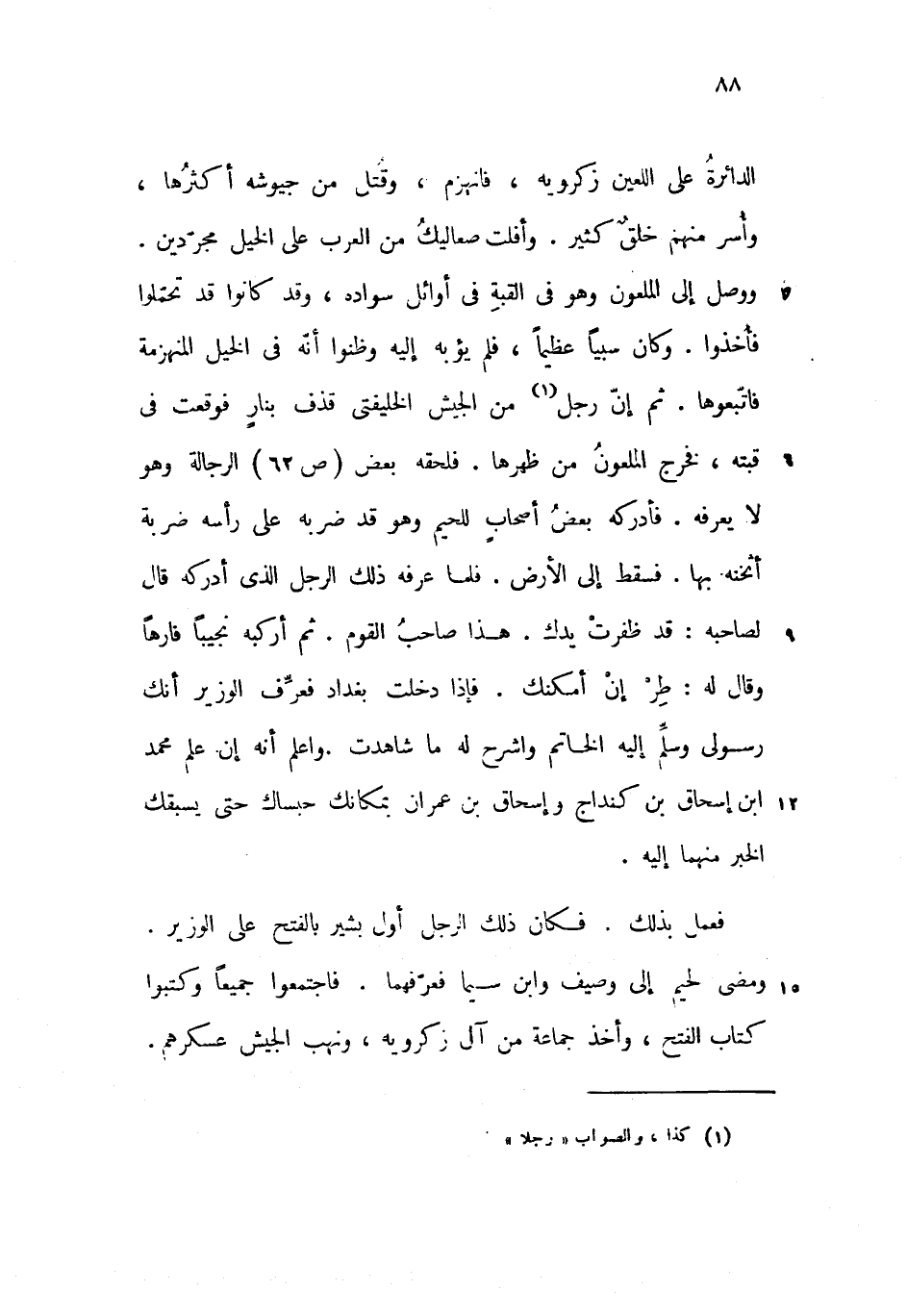 ووصل إلى الملعون وهو فى القبة فى أوائل سواده، وقد كانوا قد تحمّلوا فأخذوا. وكان سبيا عظيما، فلم يؤبه إليه وظنوا أنّه فى الخيل المنهزمة فاتّبعوها. ثم إنّ رجل من الجيش الخليفتى قذف بنار فوقعت فى قبته، فخرج الملعون من ظهرها. فلحقه بعض (ص 62) الرجالة وهو لا يعرفه. فأدركه بعض أصحاب للحيم وهو قد ضربه على رأسه ضربة أثخنه بها. فسقط إلى الأرض. فلما عرفه ذلك الرجل الذى أدركه قال لصاحبه: قد ظفرت يدك. هذا صاحب القوم. ثم أركبه نجيبا فارها وقال له: طر إن أمكنك. فإذا دخلت بغداد فعرّف الوزير أنك رسولى وسلّم إليه الخاتم واشرح له ما شاهدت. واعلم أنه إن علم محمد ابن إسحاق بن كنداج وإسحاق بن عمران بمكانك حبساك حتى يسبقك الخبر منهما إليه.