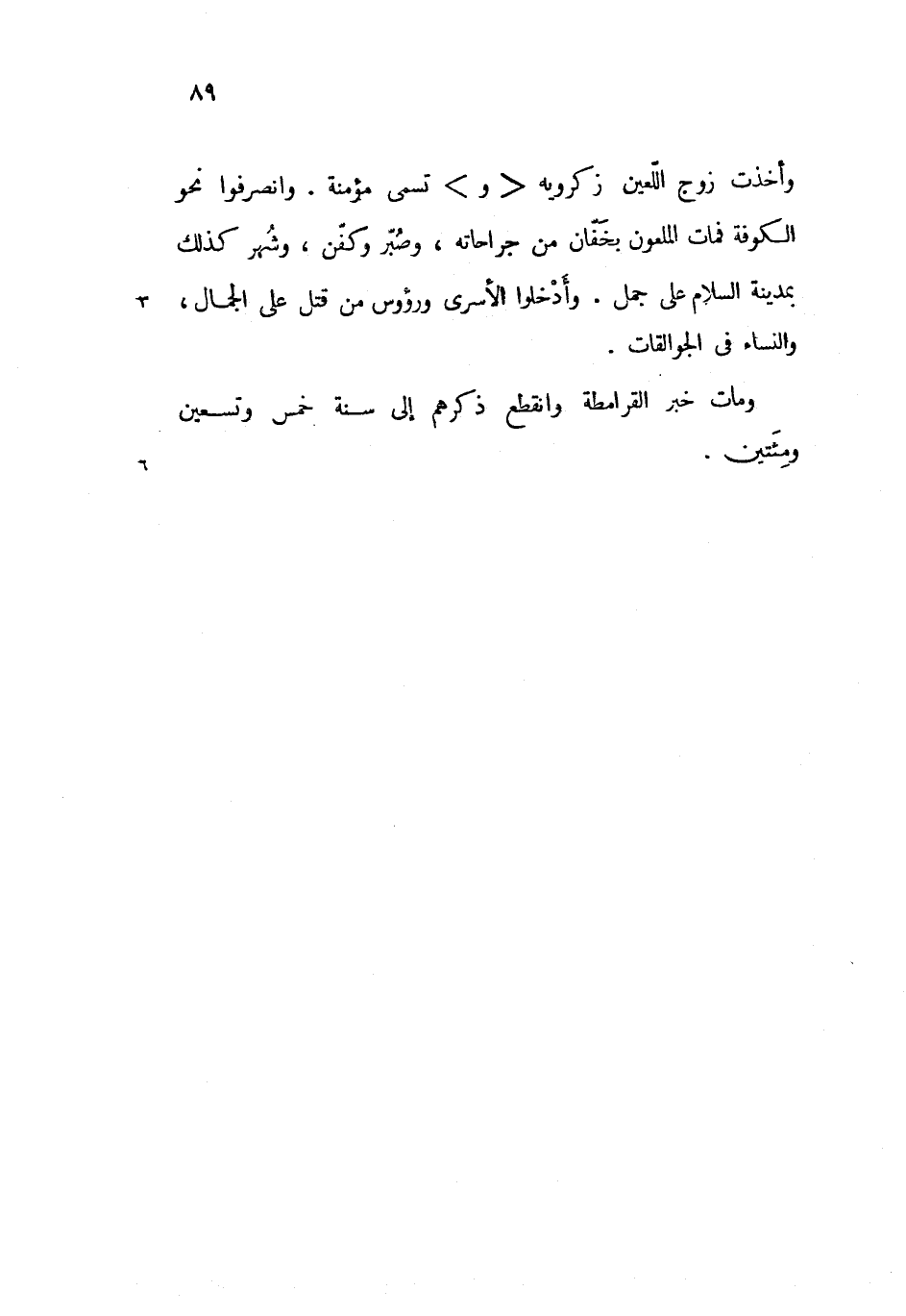 وأخذت زوج اللعين زكرويه <و> تسمى مؤمنة. وانصرفوا نحو الكوفة فمات الملعون بخفّان من جراحاته، وصبّر وكفّن، وشهر كذلك بمدينة السلام على جمل. وأدخلوا الأسرى ورؤوس من قتل على الجمال، والنساء فى الجوالقات.