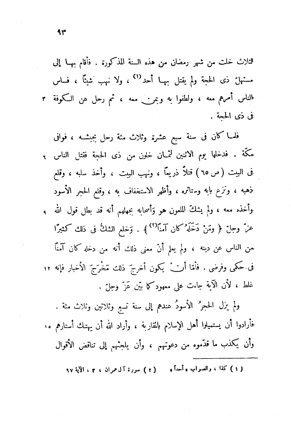 فلما كان فى سنة سبع عشرة وثلاث مئة رحل بجيشه، فوافى مكّة. فدخلها يوم الاثنين لثمان خلون من ذى الحجة فقتل الناس فى البيت (ص 65) قتلا ذريعا، ونهب البيت، وأخذ سلبه، وقلع ذهبه، ونزع بابه وستائره، وأظهر الاستخفاف به، وقلع الحجر الأسود وأخذه معه، ولم يشكّ الملعون هو وأصحابه بجهلهم أنه قد بطل قول الله عزّ وجلّ ({وَمَنْ دَخَلَهُ كانَ آمِناً}). وخلع الشكّ فى ذلك كثيرا من الناس عن دينه، ولم يعلم أنّ معنى ذلك أنه من دخله كان آمنا فى حكمى وفرضى. فأمّا أن يكون أخرج ذلك مخرج الأخبار فإنه غلط، لأن الآية جاءت على معهود كما بيّن عزّ وجلّ.