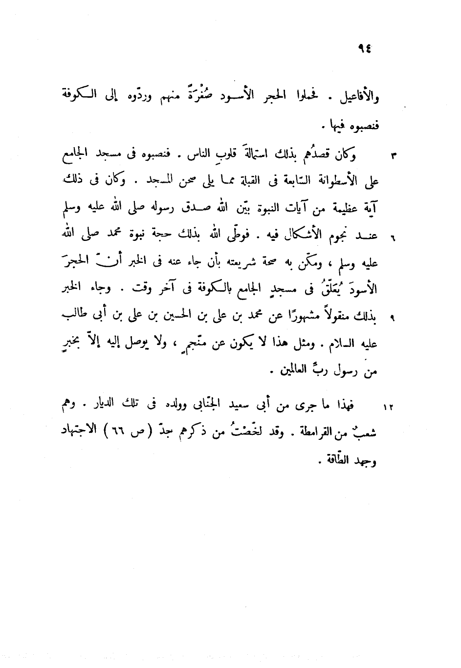 وكان قصدهم بذلك استمالة قلوب الناس. فنصبوه فى مسجد الجامع على الأسطوانة السّابعة فى القبلة مما يلى صحن المسجد. وكان فى ذلك آية عظيمة من آيات النبوة بيّن الله صدق رسوله صلّى الله عليه وسلم عند نجوم الأشكال فيه. فوطّى الله بذلك حجة نبوة محمد صلى الله عليه وسلم، ومكّن به صحة شريعته بأن جاء عنه فى الخبر أنّ الحجر الأسود يعلّق فى مسجد الجامع بالكوفة فى آخر وقت. وجاء الخبر بذلك منقولا مشهورا عن محمد بن على بن الحسين بن على بن أبى طالب عليه السلام. ومثل هذا لا يكون عن منّجم، ولا يوصل إليه إلاّ بخبر من رسول ربّ العالمين.