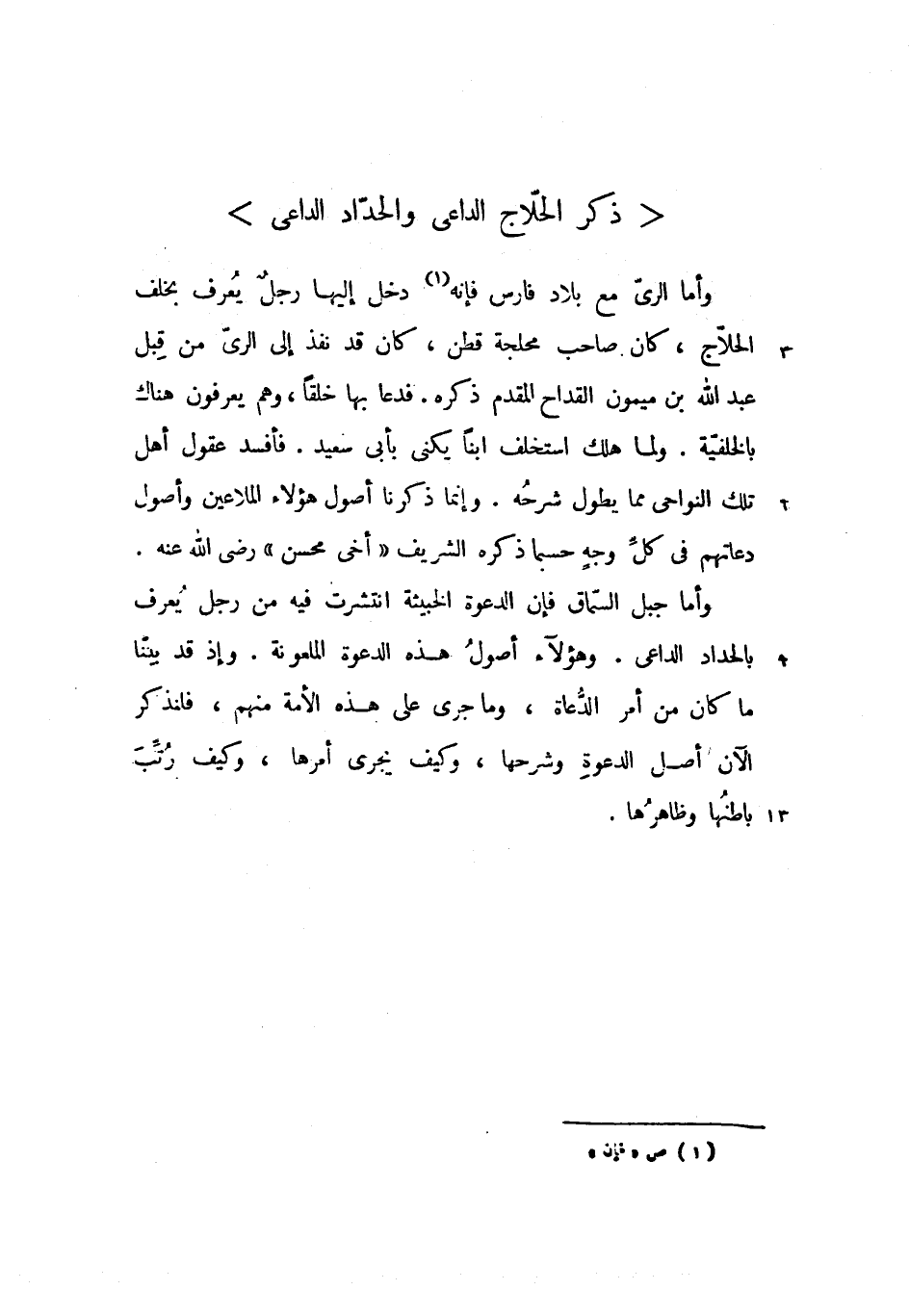 وأما الرىّ مع بلاد فارس فإنه دخل إليها رجل يعرف بخلف الحلاّج، كان صاحب محلجة قطن، كان قد نفذ إلى الرىّ من قبل عبد الله بن ميمون القداح المقدم ذكره. فدعا بها خلقا، وهم يعرفون هناك بالخلفيّة. ولما هلك استخلف ابنا يكنى بأبى سعيد. فأفسد عقول أهل تلك النواحى مما يطول شرحه. وإنما ذكرنا أصول هؤلاء الملاعين وأصول دعاتهم فى كلّ وجه حسبما ذكره الشريف «أخى محسن» رضى الله عنه.