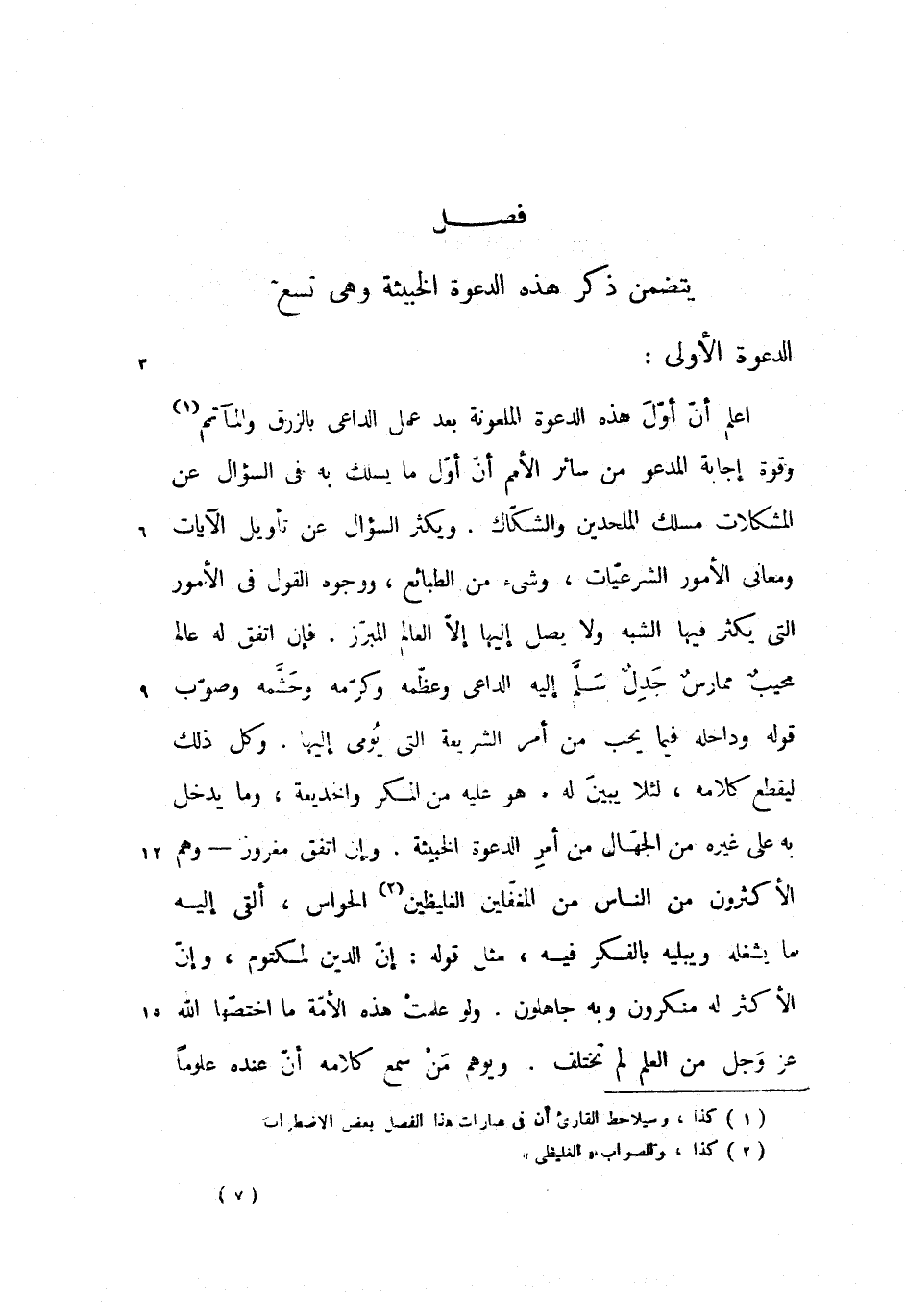 اعلم أنّ أوّل هذه الدعوة الملعونة بعد عمل الداعى بالزرق والمآتم وقوة إجابة المدعو من سائر الأمم أنّ أوّل ما يسلك به فى السؤال عن المشكلات مسلك الملحدين والشكّاك. ويكثر السؤال عن تأويل الآيات ومعانى الأمور الشرعيّات، وشئ من الطبائع، ووجوه القول فى الأمور التى يكثر فيها الشبه ولا يصل إليها إلاّ العالم المبرّز. فإن اتفق له عالم مجيب ممارس جدل سلّم إليه الداعى وعظّمه وكرّمه وحشّمه وصوّب قوله وداخله فيما يحب من أمر الشريعة التى يومى إليها. وكل ذلك ليقطع كلامه، لئلا يبين له ما هو عليه من المكر والخديعة، وما يدخل به على غيره من الجهّال من أمر الدعوة الخبيثة. وإن اتفق مغرور-وهم الأكثرون من الناس من المغفّلين الغليظين الحواس، ألقى إليه ما يشغله ويبليه بالفكر فيه، مثل قوله: إنّ الدين لمكتوم، وإنّ الأكثر له منكرون وبه جاهلون. ولو علمت هذه الأمّة ما اختصّها الله عز وجل من العلم لم تختلف. ويوهم من سمع كلامه أنّ عنده علوما