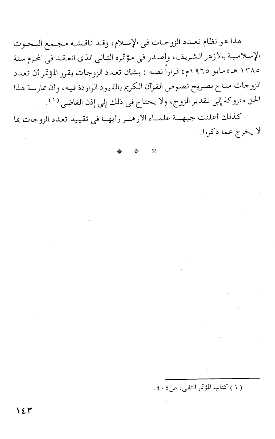 1385 هـ" مايو 965 1 م " قرارا نصه: بشأن تعدد الزوجات يقرر المؤتمر أن تعدد