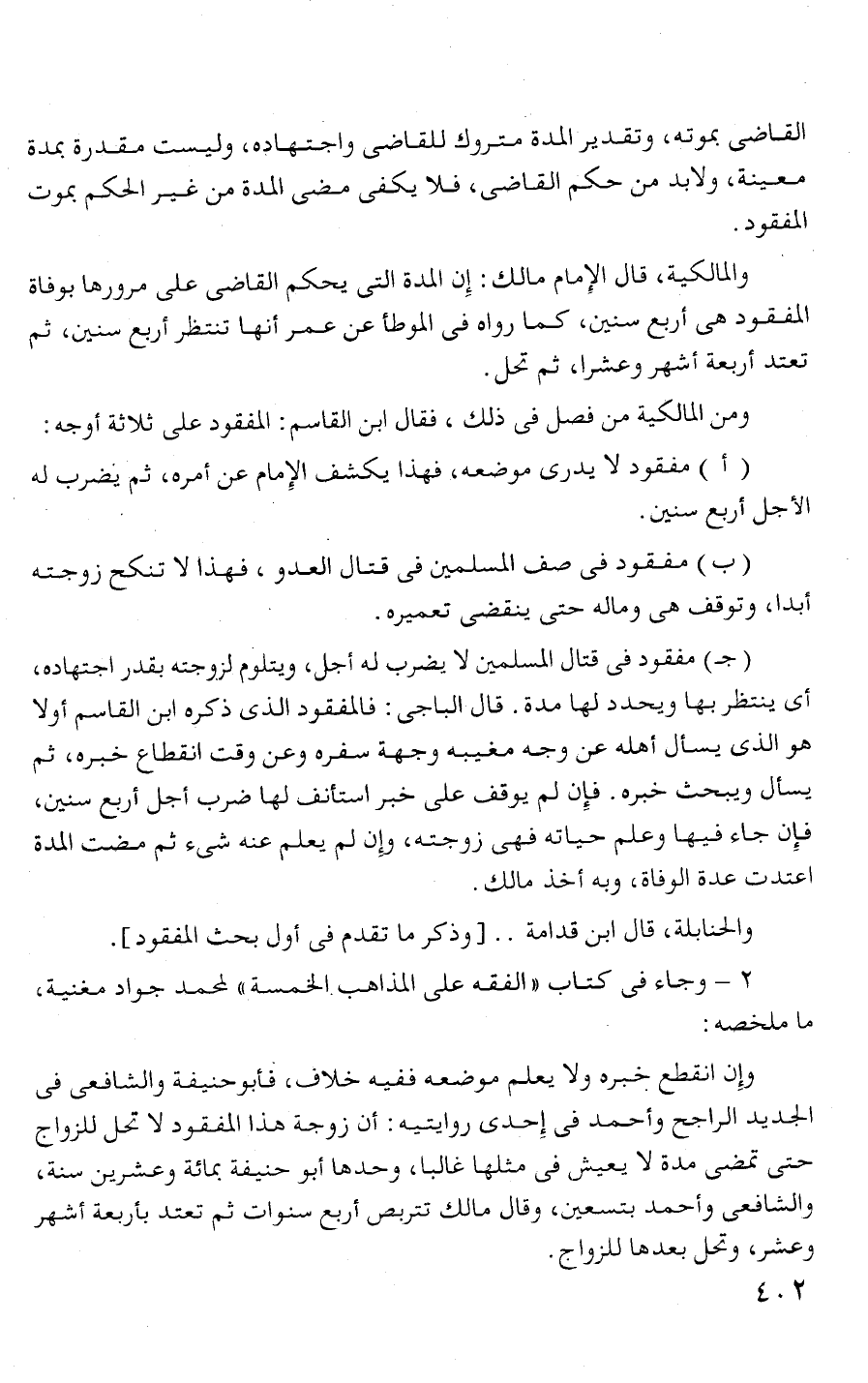 المفقود هى أربع سنين، كما رواه فى الموول عن عمر أنها تنتظر أربع سنين، ثم
