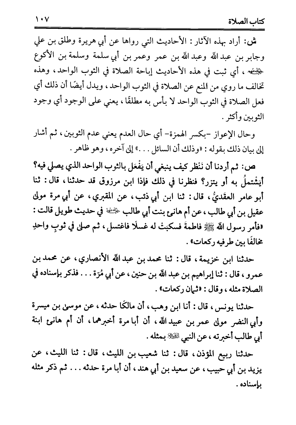 ص: ثم أردنا أن نَنْظر كيف ينبغي أن يَفْعَل بالثوب الواحد الذي يصلي فيه؟ أيَشْتملُ به أو يتزر؟ فنظرنا في ذلك فإذا ابن مرزوق قد حدثنا، قال: ثنا أبو عامر العقَديُّ، قال: ثنا ابن أبي ذئب، عن المقبري، عن أبي مرة مولى عقيل بن أبي طالب، عن أم هانئ بنت أبي طالب - رضي الله عنها - في حديث طويل قالت: "فأمر رسول الله - عليه السلام - فاطمةَ فسكبَتْ له غسلًا فاغتسل، ثم صلى في ثوبٍ واحدٍ مخالفًا بين طرفيه ركعات".