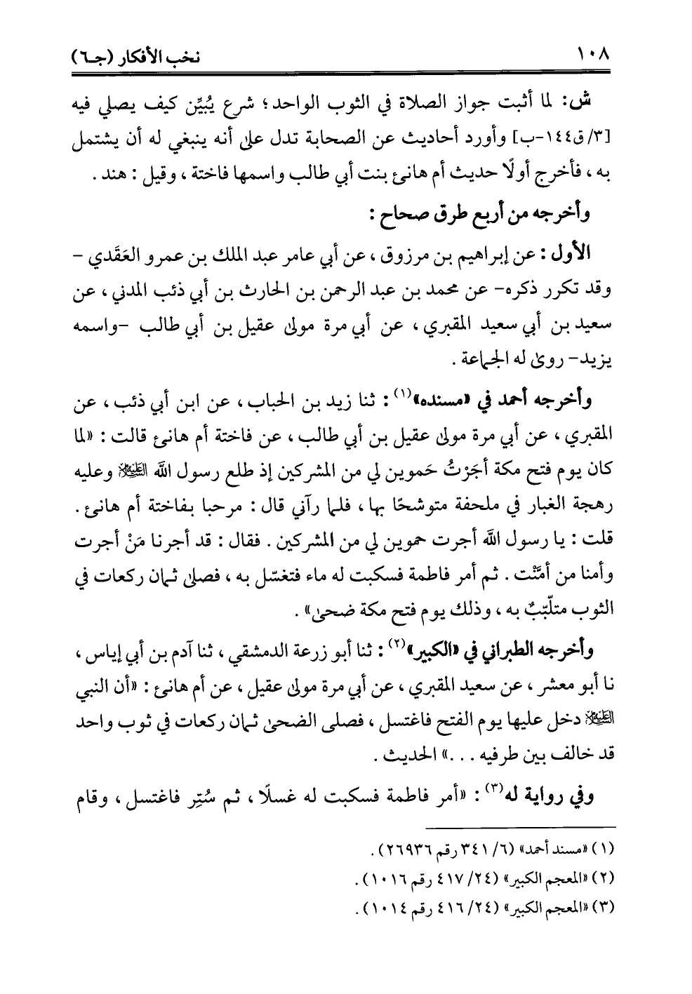 وأخرجه أحمد في "مسنده" (¬1): ثنا زيد بن الحباب، عن ابن أبي ذئب، عن المقبري، عن أبي مرة مولى عقيل بن أبي طالب، عن فاختة أم هانئ قالت: "لما كان يوم فتح مكة أجَرْتُ حَموين لي من المشركين إذ طلع رسول الله - عليه السلام - وعليه رهجة الغبار في ملحفة متوشحًا بها، فلما رآني قال: مرحبا بفاختة أم هانئ. قلت: يا رسول الله أجرت حموين لي من المشركين. فقال: قد أجرنا مَنْ أجرت وأمنا من أمَّنْت. ثم أمر فاطمة فسكبت له ماء فتغسّل به، فصلى ثمان ركعات في الثوب متلّبّبٌ به، وذلك يوم فتح مكة ضحى".