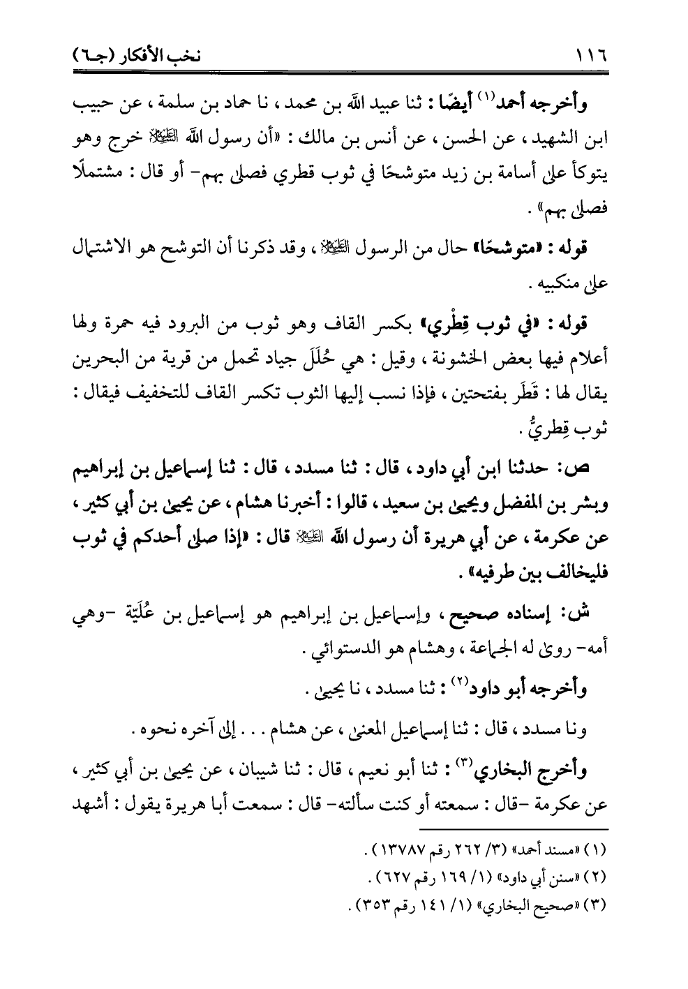 وأخرجه أحمد (¬1) أيضًا: ثنا عبيد الله بن محمَّد، نا حماد بن سلمة، عن حبيب ابن الشهيد، عن الحسن، عن أنس بن مالك: "أن رسول الله - عليه السلام - خرج وهو يتوكأ على أسامة بن زيد متوشحًا في ثوب قطري فصلَّى بهم- أو قال: مشتملًا فصلَّى بهم".