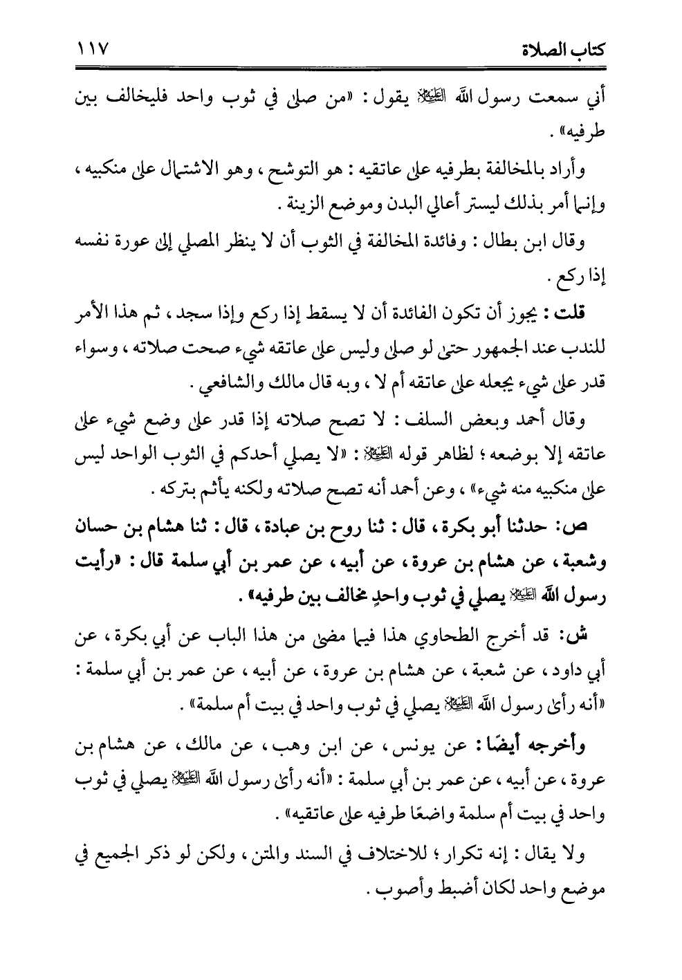 ص: حدثنا أبو بكرة، قال: ثنا روح بن عبادة، قال: ثنا هشام بن حسان وشعبة، عن هشام بن عروة، عن أبيه، عن عمر بن أبي سلمة قال: "رأيت رسول الله - عليه السلام - يصلي في ثوب واحدٍ مخالف بين طرفيه".