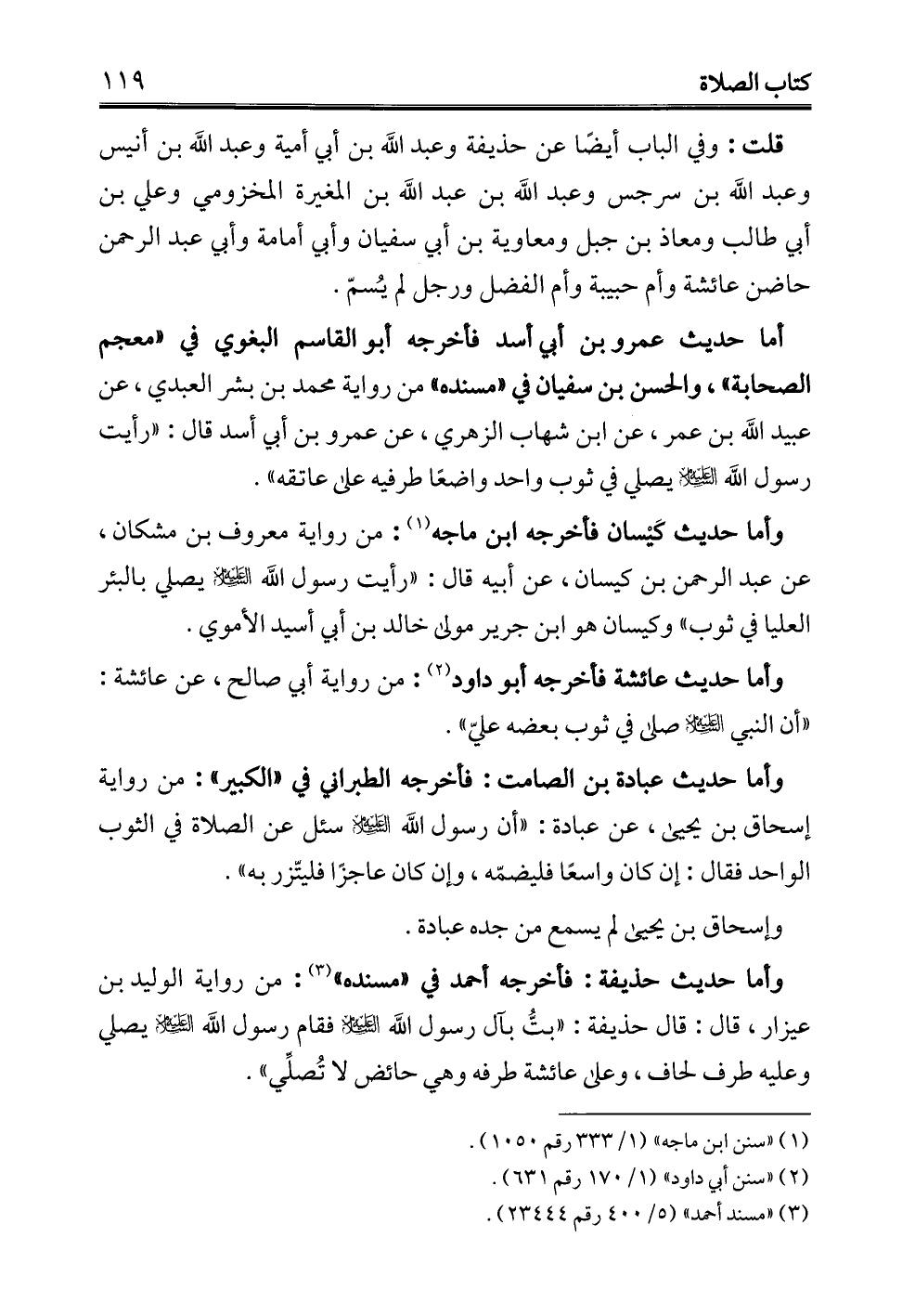 أما حديث عمرو بن أبي أسد فأخرجه أبو القاسم البغوي في "معجم الصحابة"، والحسن بن سفيان في "مسنده" من رواية محمَّد بن بشر العبدي، عن عبيد الله بن عمر، عن ابن شهاب الزهري، عن عمرو بن أبي أسد قال: "رأيت رسول الله - عليه السلام - يصلي في ثوب واحد واضعًا طرفيه على عاتقه".