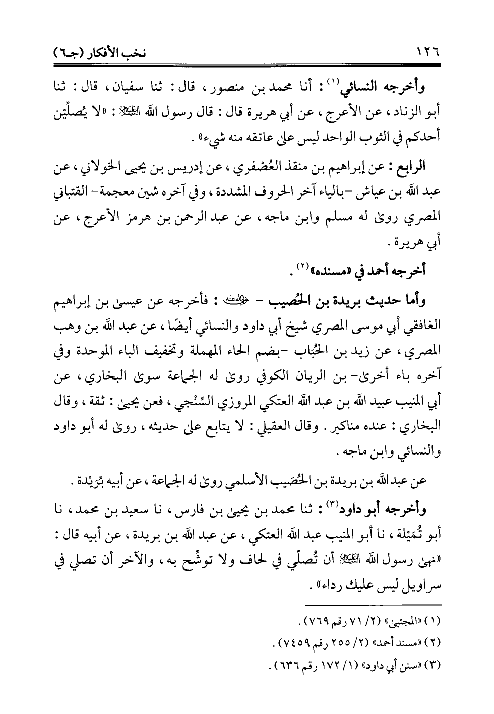 وأما حديث بريدة بن الحُصيب - رضي الله عنه -: فأخرجه عن عيسى بن إبراهيم الغافقي أبي موسى المصري شيخ أبي داود والنسائي أيضًا، عن عبد الله بن وهب المصري، عن زيد بن الحُبَاب -بضم الحاء المهملة وتخفيف الباء الموحدة وفي آخره باء أخرى- بن الريان الكوفي روى له الجماعة سوى البخاري، عن أبي المنيب عبيد الله بن عبد الله العتكي المروزي السِّنْجي، فعن يحيى: ثقة، وقال البخاري: عنده مناكير. وقال العقيلي: لا يتابع على حديثه، روى له أبو داود والنسائي وابن ماجه.