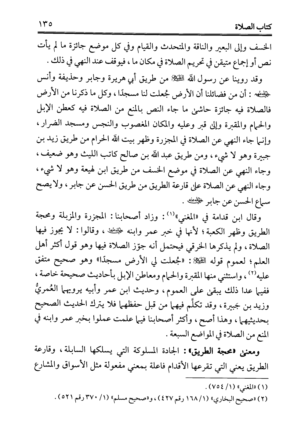 وقال ابن قدامة في "المغني" (¬1): وزاد أصحابنا: المجزرة والمزبلة ومحجة الطريق وظهر الكعبة؛ لأنها في خبر عمر وابنه - رضي الله عنهما -، وقالوا: لا يجوز فيها الصلاة، ولم يذكرها الخرقي فيحتمل أنه جوّز الصلاة فيها وهو قول أكثر أهل العلم؛ لعموم قوله: "جُعلت لي الأرض مسجدًا" وهو صحيح متفق عليه (¬2)، واستثني منها المقبرة والحمام ومعاطن الإبل بأحاديث صحيحة خاصة، ففيما عدا ذلك يبقى على العموم، وحديث ابن عمر وأبيه يرويهما العُمريُّ وزيد بن جَبيرة، وقد تكلَّم فيهما من قبل حفظهما فلا يترك الحديث الصحيح بحديثيهما، وهذا أصح، وأكثر أصحابنا فيما علمت عملوا بخبر عمر وابنه في المنع من الصلاة في المواضع السبعة.