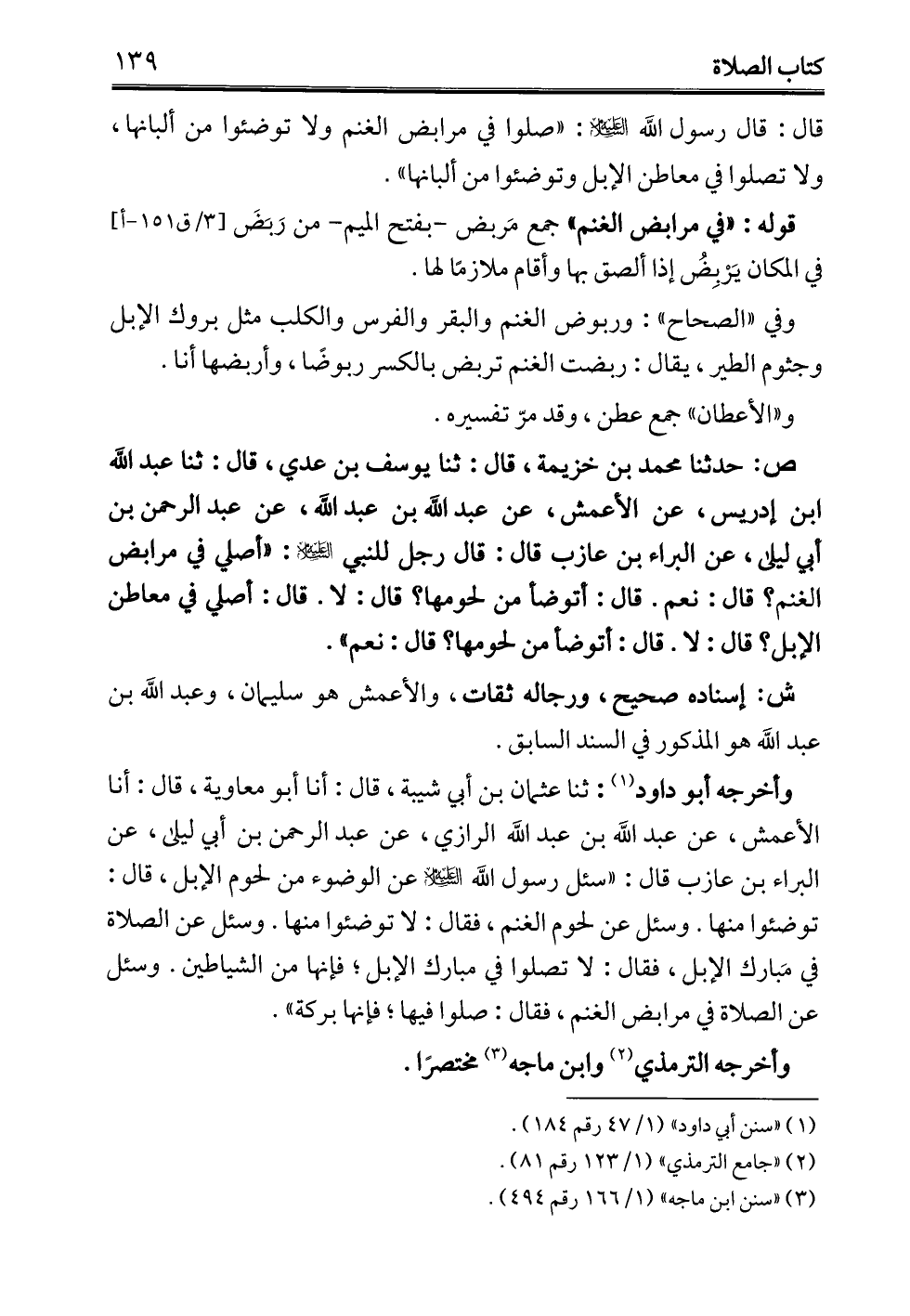 وأخرجه أبو داود (¬1): ثنا عثمان بن أبي شيبة، قال: أنا أبو معاوية، قال: أنا الأعمش، عن عبد الله بن عبد الله الرازي، عن عبد الرحمن بن أبي ليلى، عن البراء بن عازب قال: "سئل رسول الله - عليه السلام - عن الوضوء من لحوم الإبل، قال: توضئوا منها. وسئل عن لحوم الغنم، فقال: لا توضئوا منها. وسئل عن الصلاة في مَبارك الإبل، فقال: لا تصلوا في مبارك الإبل؛ فإنها من الشياطن. وسئل عن الصلاة في مرابض الغنم، فقال: صلوا فيها؛ فإنها بركة".