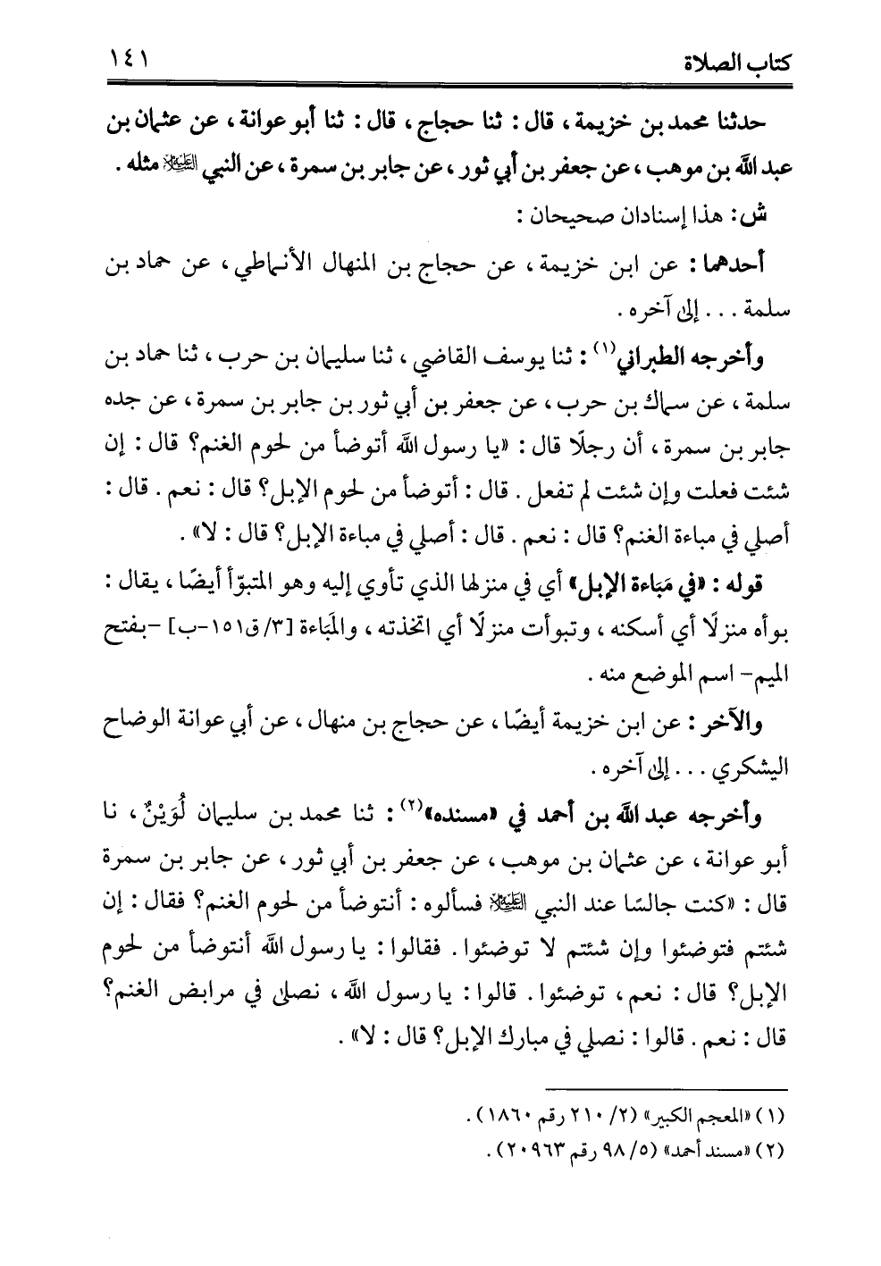 وأخرجه الطبراني (¬1): ثنا يوسف القاضي، ثنا سليمان بن حرب، ثنا حماد بن سلمة، عن سماك بن حرب، عن جعفر بن أبي ثور بن جابر بن سمرة، عن جده جابر بن سمرة، أن رجلًا قال: "يا رسول الله أتوضأ من لحوم الغنم؟ قال: إن شئت فعلت وإن شئت لم تفعل. قال: أتوضأ من لحوم الإبل؟ قال: نعم. قال: أصلي في مباءة الغنم؟ قال: نعم. قال: أصلي في مباءة الإبل؟ قال: لا".