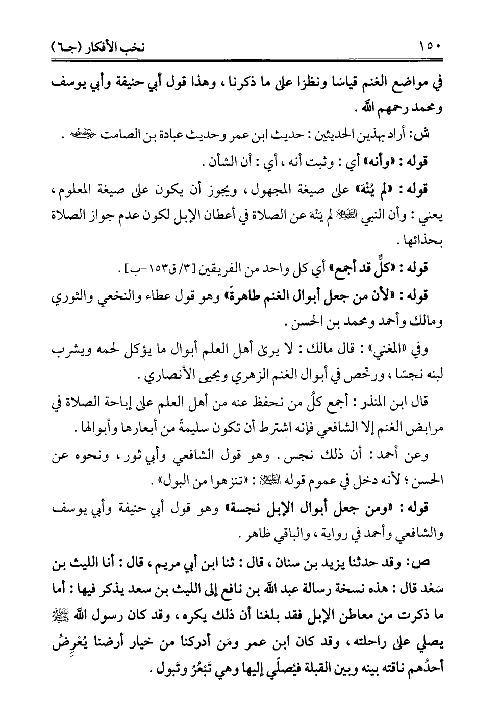ص: وقد حدثنا يزيد بن سنان، قال: ثنا ابن أبي مريم، قال: أنا الليث بن سَعْد قال: هذه نسخة رسالة عبد الله بن نافع إلى الليث بن سعد يذكر فيها: أما ما ذكرت من معاطن الإبل فقد بلغنا أن ذلك يكره، وقد كان رسول الله - عليه السلام - يصلي على راحلته، وقد كان ابن عمر ومَن أدركنا من خيار أرضنا يُعْرِضُ أحدُهم ناقته بينه وبين القبلة فيُصلّي إليها وهي تَبْعُر وتَبول.