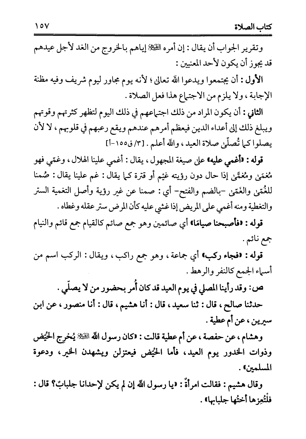 وهشام، عن حفصة، عن أم عطية قالت: "كان رسول الله - عليه السلام - يُخرِج الحُيّض وذوات الخدور يوم العيد، فأما الحُيّض فيعتزلن ويشهدن الخير، ودعوة المسلمين".