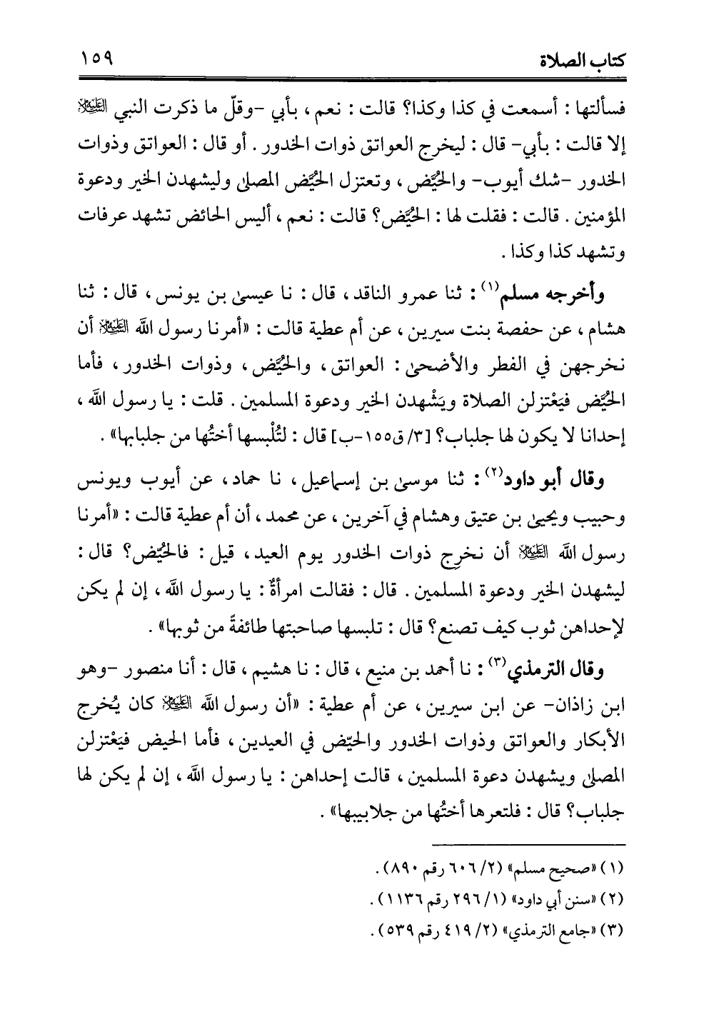 فسألتها: أسمعت في كذا وكذا؟ قالت: نعم، بأبي -وقلّ ما ذكرت النبي - عليه السلام - إلا قالت: بأبي- قال: ليخرج العواتق ذوات الخدور. أو قال: العواتق وذوات الخدور -شك أيوب- والحُيَّض، وتعتزل الحُيَّض المصلى وليشهدن الخير ودعوة المؤمنين. قالت: فقلت لها: الحُيَّض؟ قالت: نعم، أليس الحائض تشهد عرفات وتشهد كذا وكذا.