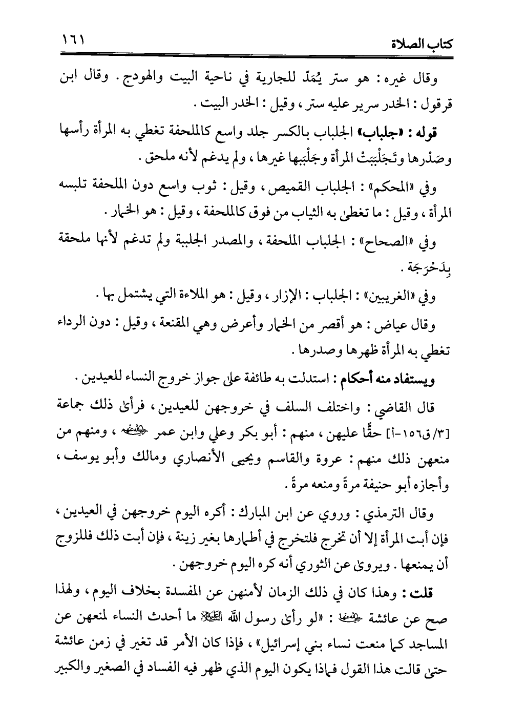 قال القاضي: واختلف السلف في خروجهن للعيدين، فرأى ذلك جماعة حقًّا عليهن، منهم: أبو بكر وعلي وابن عمر - رضي الله عنهم -، ومنهم من منعهن ذلك منهم: عروة والقاسم ويحيى الأنصاري ومالك وأبو يوسف، وأجازه أبو حنيفة مرةً ومنعه مرةً.