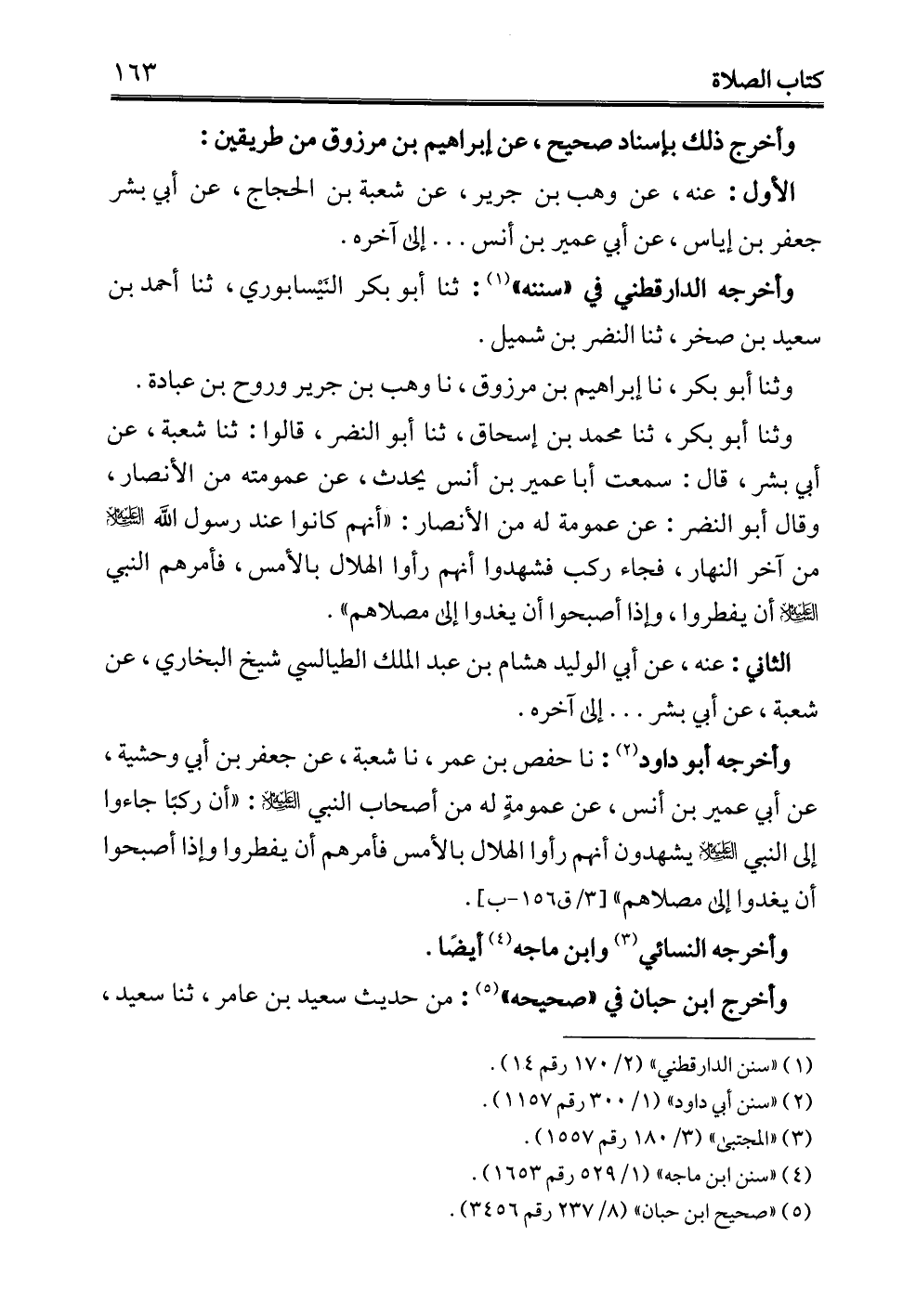 وثنا أبو بكر، ثنا محمَّد بن إسحاق، ثنا أبو النضر، قالوا: ثنا شعبة، عن أبي بشر، قال: سمعت أبا عمير بن أنس يحدث، عن عمومته من الأنصار، وقال أبو النضر: عن عمومة له من الأنصار: "أنهم كانوا عند رسول الله - عليه السلام - من آخر النهار، فجاء ركب فشهدوا أنهم رأوا الهلال بالأمس، فأمرهم النبي - عليه السلام - أن يفطروا، وإذا أصبحوا أن يغدوا إلى مصلاهم".
