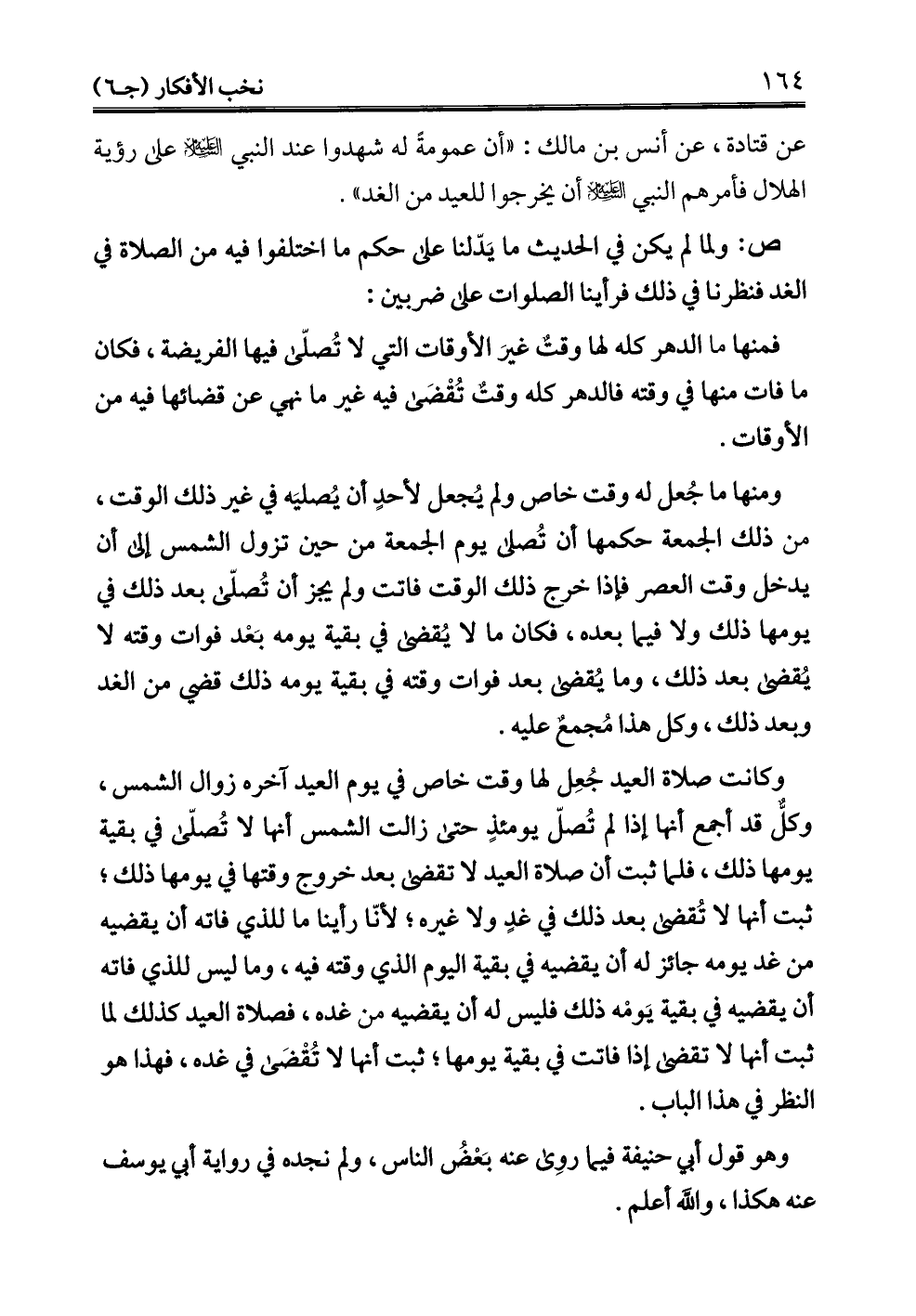 عن قتادة، عن أنس بن مالك: "أن عمومةً له شهدوا عند النبي - عليه السلام - على رؤية الهلال فأمرهم النبي - عليه السلام - أن يخرجوا للعيد من الغد".