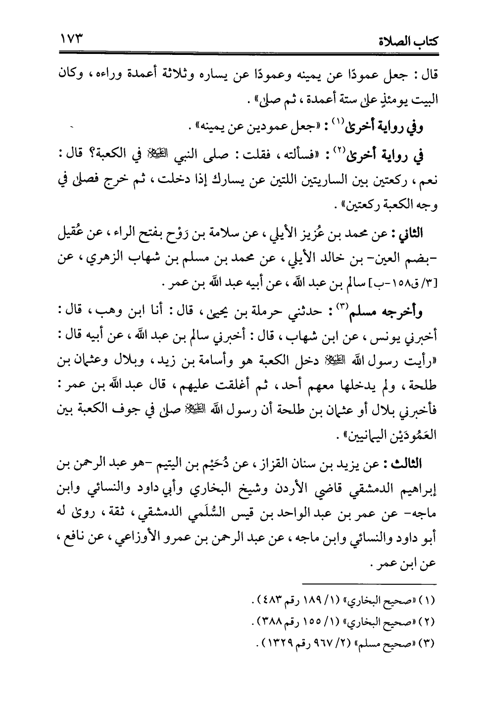 وأخرجه مسلم (¬3): حدثني حرملة بن يحيى، قال: أنا ابن وهب، قال: أخبرني يونس، عن ابن شهاب، قال: أخبرني سالم بن عبد الله، عن أبيه قال: "رأيت رسول الله - عليه السلام - دخل الكعبة هو وأسامة بن زيد، وبلال وعثمان بن طلحة، ولم يدخلها معهم أحد، ثم أغلقت عليهم، قال عبد الله بن عمر: فأخبرني بلال أو عثمان بن طلحة أن رسول الله - عليه السلام - صلى في جوف الكعبة بين العَمُودَيْن اليمانيين".