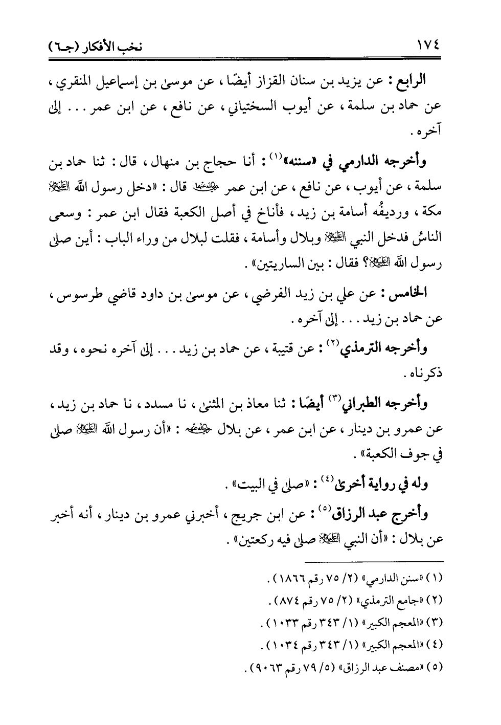 وأخرجه الطبراني (¬3) أيضًا: ثنا معاذ بن المثنى، نا مسدد، نا حماد بن زيد، عن عمرو بن دينار، عن ابن عمر، عن بلال - رضي الله عنه -: "أن رسول الله - عليه السلام - صلى في جوف الكعبة".