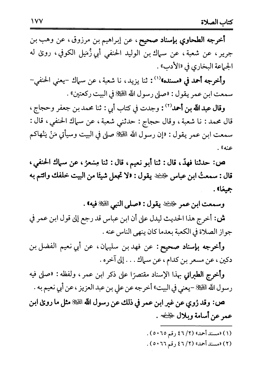 وقال عبد الله بن أحمد (¬2): وجدت في كتاب أبي: ثنا محمَّد بن جعفر وحجاج، قال محمَّد: نا شعبة، وقال حجاج: حدثني شعبة، عن سماك الحنفي، قال: سمعت ابن عمر يقول: "إن رسول الله - عليه السلام - صلى في البيت وسيأتي مَنْ يَنْهاكم عنه".
