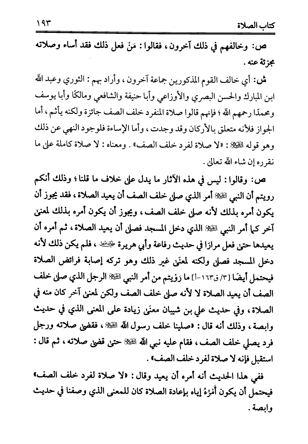 ص: وقالوا: ليس في هله الآثار ما يدل على خلاف ما قلنا؛ وذلك أنكم رويتم أن النبي - عليه السلام - أمر الذي صلى خلف الصف أن يعيد الصلاة، فقد يجوز أن يكون أمره بذلك لأنه صلى خلف الصف، ويجوز أن يكون أمره بذلك لمعنى آخر كما أمر النبي - عليه السلام - الذي دخل المسجد فصلى أن يعيد الصلاة، ثم أمره أن يعيدها حتى فعل مرارًا في حديث رفاعة وأبي هريرة - رضي الله عنهما -، فلم يكن ذلك لأنه دخل المسجد فصلى ولكنه لمعنًى غير ذلك وهو تركه إصابة فرائض الصلاة فيحتمل أيضًا ما رَوْيتم من أمر النبي - عليه السلام - الرجل الذي صلى خلف الصف أن يعيد الصلاة لا لأنه صلى خلف الصف ولكن لمعنى آخر كان منه في الصلاة، وفي حديث علي بن شيبان معنًى زيادة على المعنى الذي في حديث وابصة، وذلك أنه قال: "صلينا خلف رسول الله - عليه السلام -، فقضى صلاته ورجل فرد يصلي خلف الصف، فقام عليه نبي - عليه السلام - حتى قضى صلاته، ثم قال: استقبل فإنه لا صلاة لفرد خلف الصف".