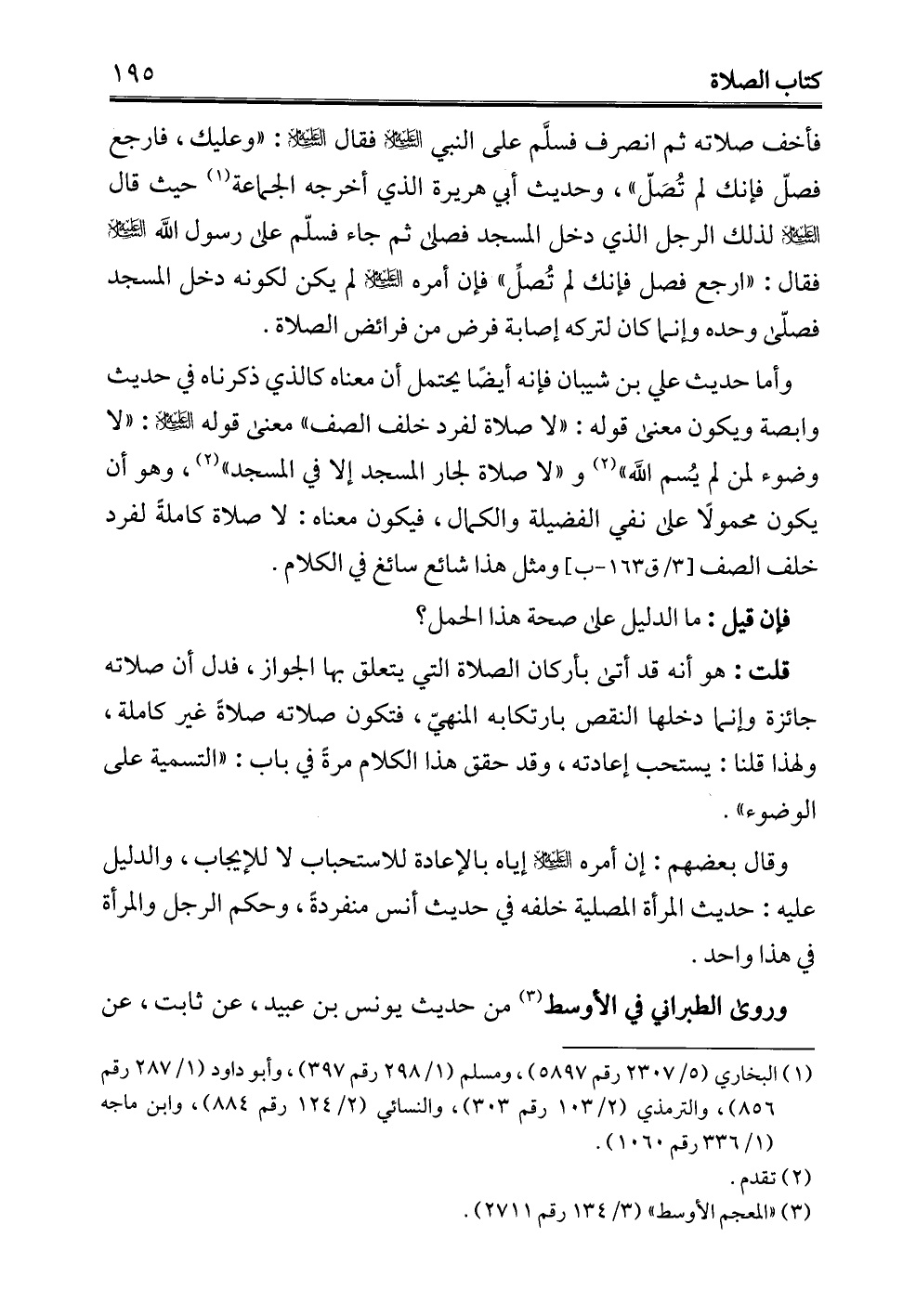 وأما حديث علي بن شيبان فإنه أيضًا يحتمل أن معناه كالذي ذكرناه في حديث وابصة ويكون معنى قوله: "لا صلاة لفرد خلف الصف" معنى قوله - عليه السلام -: "لا وضوء لمن لم يُسم الله" (¬2) و"لا صلاة لجار المسجد إلا في المسجد" (2)، وهو أن يكون محمولًا على نفي الفضيلة والكمال، فيكون معناه: لا صلاة كاملةً لفرد خلف الصف ومثل هذا شائع سائغ في الكلام.