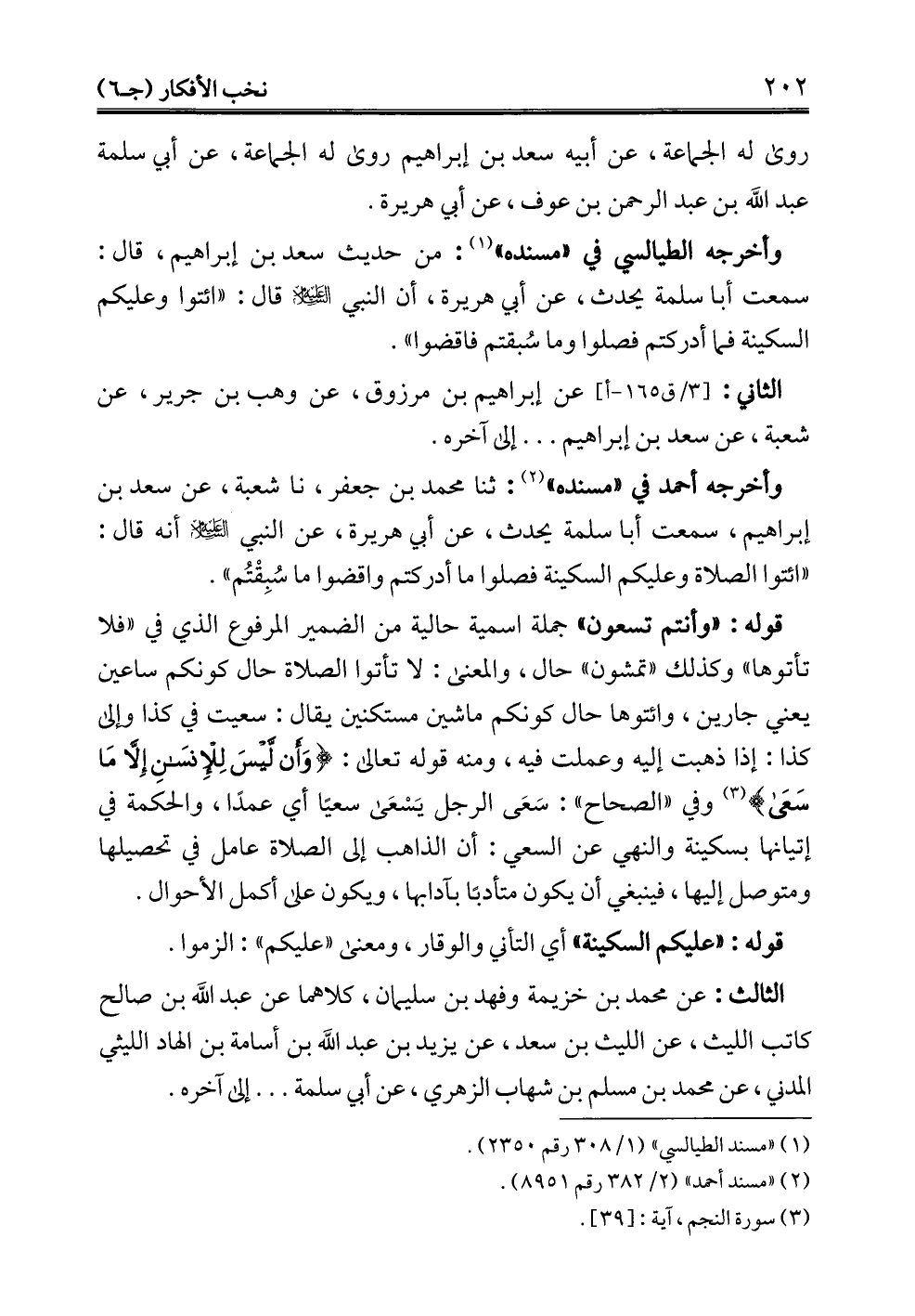 وأخرجه الطيالسي في "مسنده" (¬1): من حديث سعد بن إبراهيم، قال: سمعت أبا سلمة يحدث، عن أبي هريرة، أن النبي - عليه السلام - قال: "ائتوا وعليكم السكينة فما أدركتم فصلوا وما سُبقتم فاقضوا".