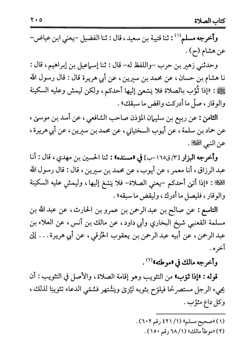 وحدثني زهير بن حرب -واللفظ له- قال: ثنا إسماعيل بن إبراهيم، قال: نا هشام بن حسان، عن محمَّد بن سيرين، عن أبي هريرة قال: قال رسول الله - صلى الله عليه وسلم -: "إذا ثُوِّب بالصلاة فلا يَسْعى إليها أحدكم، ولكن ليمش وعليه السكينة والوقار، صلّ ما أدركت واقض ما سبقك".