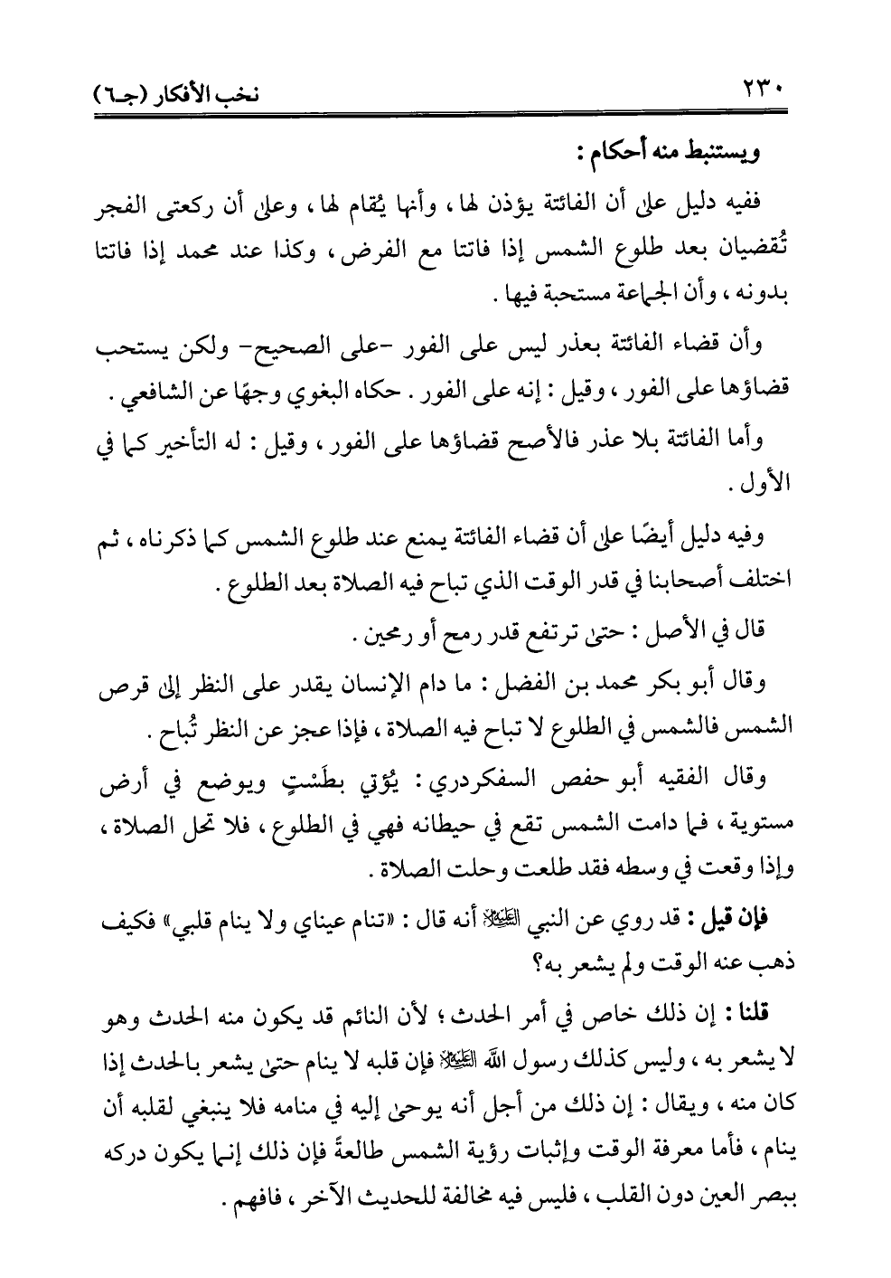 قلنا: إن ذلك خاص في أمر الحدث؛ لأن النائم قد يكون منه الحدث وهو لا يشعر به، وليس كذلك رسول الله- عليه السلام - فإن قلبه لا ينام حتى يشعر بالحدث إذا كان منه، ويقال: إن ذلك من أجل أنه يوحى إليه في منامه فلا ينبغي لقلبه أن ينام، فأما معرفة الوقت وإثبات رؤية الشمس طالعةً فإن ذلك إنما يكون دركه ببصر العين دون القلب، فليس فيه مخالفة للحديث الآخر، فافهم.