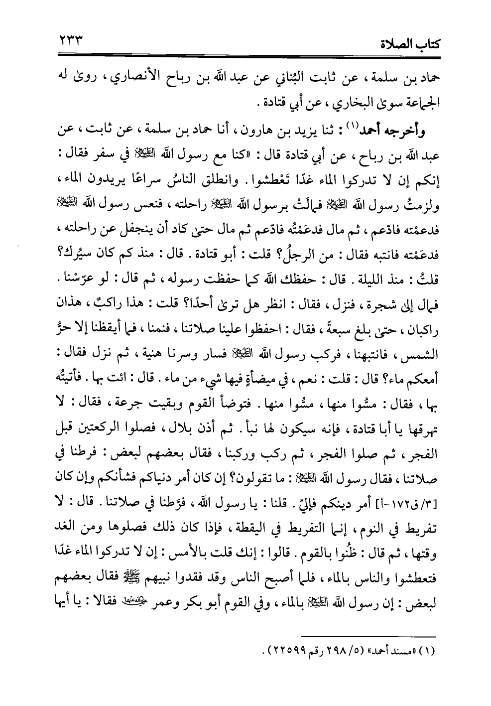وأخرجه أحمد (¬1): ثنا يزيد بن هارون، أنا حماد بن سلمة، عن ثابت، عن عبد الله بن رباح، عن أبي قتادة قال: "كنا مع رسول الله - عليه السلام - في سفر فقال: إنكم إن لا تدركوا الماء غدًا تَعْطشوا. وانطلق الناسُ سراعًا يريدون الماء، ولزمتُ رسول الله - عليه السلام - فمالَتْ برسول الله - عليه السلام - راحلته، فنعس رسول الله - عليه السلام - فدعمْته فادّعم، ثم مال فدعَمْتُه فادّعم ثم مال حتى كاد أن ينجفل عن راحلته، فدعَمْته فانتبه فقال: من الرجلُ؟ قلت: أبو قتادة. قال: منذ كم كان سيُرك؟ قلتُ: منذ الليلة. قال: حفظك الله كما حفظت رسوله، ثم قال: لو عرّسْنا. فمال إلى شجرة، فنزل، فقال: انظر هل ترى أحدًا؟ قلت: هذا راكبٌ، هذان راكبان، حتى بلغ سبعةً، فقال: احفظوا علينا صلاتنا، فنمنا، فما أيقظنا إلا حرُّ الشمس، فانتبهنا، فركب رسول الله - عليه السلام - فسار وسرنا هنية، ثم نزل فقال: أمعكم ماء؟ قال: قلت: نعم، في ميضأةٍ فيها شيء من ماء. قال: ائت بها. فأتيتُه بها، فقال: مسُّوا منها، مسُّوا منها. فتوضأ القوم وبقيت جرعة، فقال: لا تهرقها يا أبا قتادة، فإنه سيكون لها نبأ. ثم أذن بلال، فصلوا الركعتين قبل الفجر، ثم صلوا الفجر، ثم ركب وركبنا، فقال بعضهم لبعض: فرطنا في صلاتنا، فقال رسول الله - عليه السلام -: ما تقولون؟ إن كان أمر دنياكم فشأنكم وإن كان أمر دينكم فإليّ. قلنا: يا رسول الله، فرَّطنا في صلاتنا. قال: لا تفريط في النوم، إنما التفريط في اليقطة، فإذا كان ذلك فصلوها ومن الغد وقتها، ثم قال: ظنُوا بالقوم. قالوا: إنك قلت بالأمس: إن لا تدركوا الماء غدًا فتعطشوا والناس بالماء، فلما أصبح الناس وقد فقدوا نبيهم - صلى الله عليه وسلم - فقال بعضهم لبعض: إن رسول الله - عليه السلام - بالماء، وفي القوم أبو بكر وعمر - رضي الله عنهما - فقالا: يا أيها