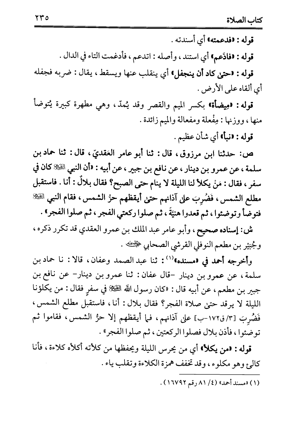 وأخرجه أحمد في "مسنده" (¬1): ثنا عبد الصمد وصفان، قالا: نا حماد بن سلمة، عن عمرو بن دينار -قال عفان: ثنا عمرو بن دينار- عن نافع بن جبير بن مطعم، عن أبيه قال: "كان رسول الله - عليه السلام - في سفرٍ فقال: من يكلؤنا الليلة لا يرقد حتى صلاة الفجر؟ فقال بلال: أنا، فاستقبل مطلع الشمس، فَضُرِبَ على آذانهم، فما أيقظهم إلا حرُّ الشمس، فقاموا ثم توضئوا، فأذن بلال فصلوا الركعتين، ثم صلوا الفجر".