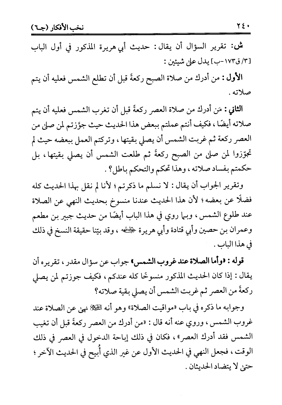 الثاني: مَن أدرك من صلاة العصر ركعةً قبل أن تغرب الشمس فعليه أن يتم صلاته أيضًا، فكيف أنتم عملتم ببعض هذا الحديث حيث جوَّزتم لمن صلى من العصر ركعة ثم غربت الشمس أن يصلي بقيتها، وتركتم العمل ببعضه حيث لم تجوّزوا لمن صلى من الصبح ركعةً ثم طلعت الشمس أن يصلي بقيتها، بل حكمتم بفساد صلاته، وهذا تحكم والتحكم باطل؟.
