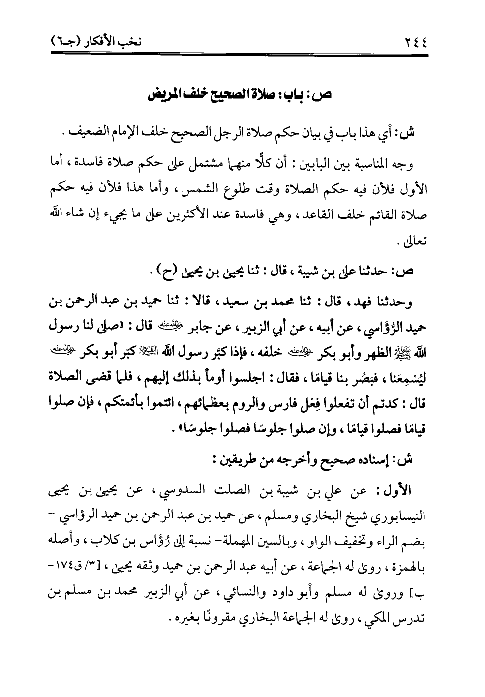 وحدثنا فهد، قال: ثنا محمد بن سعيد، قالا: ثنا حميد بن عبد الرحمن بن حميد الرُّؤَاسي، عن أبيه، عن أبي الزبير، عن جابر - رضي الله عنه - قال: "صلى لنا رسول الله - صلى الله عليه وسلم - الظهر وأبو بكر - رضي الله عنه - خلفه، فإذا كبَّر رسول الله - عليه السلام - كبّر أبو بكر - رضي الله عنه - ليُسْمِعَنا، فبَصُر بنا قيامًا، فقال: اجلسوا أومأ بذلك إليهم، فلما قضى الصلاة قال: كدتم أن تفعلوا فِعْل فارس والروم بعظمائهم، ائتموا بأئمتكم، فإن صلوا قيامًا فصلوا قيامًا، وإن صلوا جلوسًا فصلوا جلوسًا".