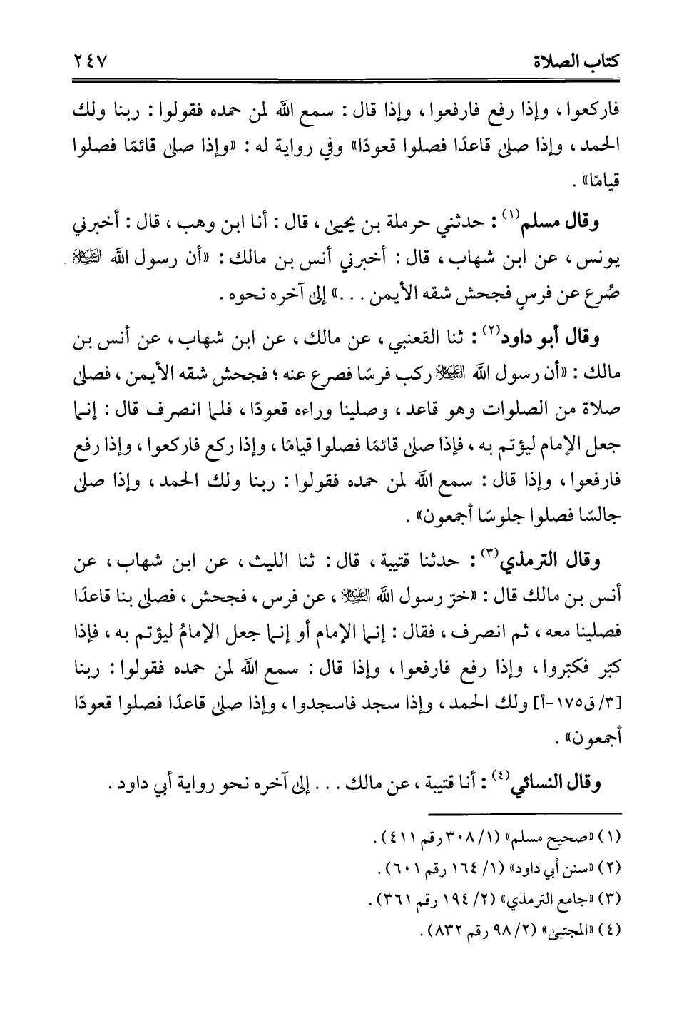 وقال أبو داود (¬2): ثنا القعنبي، عن مالك، عن ابن شهاب، عن أنس بن مالك: "أن رسول الله - عليه السلام - ركب فرسًا فصرع عنده؛ فجحش شقه الأيمن، فصلى صلاة من الصلوات وهو قاعد، وصلينا وراءه قعودًا، فلما انصرف قال: إنما جعل الإِمام ليؤتم به، فإذا صلى قائمًا فصلوا قيامًا، وإذا ركع فاركعوا، وإذا رفع فارفعوا، وإذا قال: سمع الله لمن حمده فقولوا: ربنا ولك الحمد، وإذا صلى جالسًا فصلوا جلوسًا أجمعون".