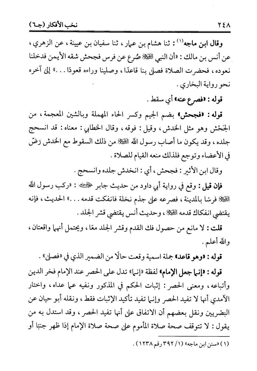 وقال ابن ماجه (¬1): ثنا هشام بن عمار، ثنا سفيان بن عيينة، عن الزهري، عن أنس بن مالك: "أن النبي- عليه السلام - صُرع عن فرس فجحش شقه الأيمن فدخلنا نعوده، فحضرت الصلاة فصل بنا قاعدًا، وصلينا وراءه قعودًا ... " إلى آخره نحو رواية البخاري.