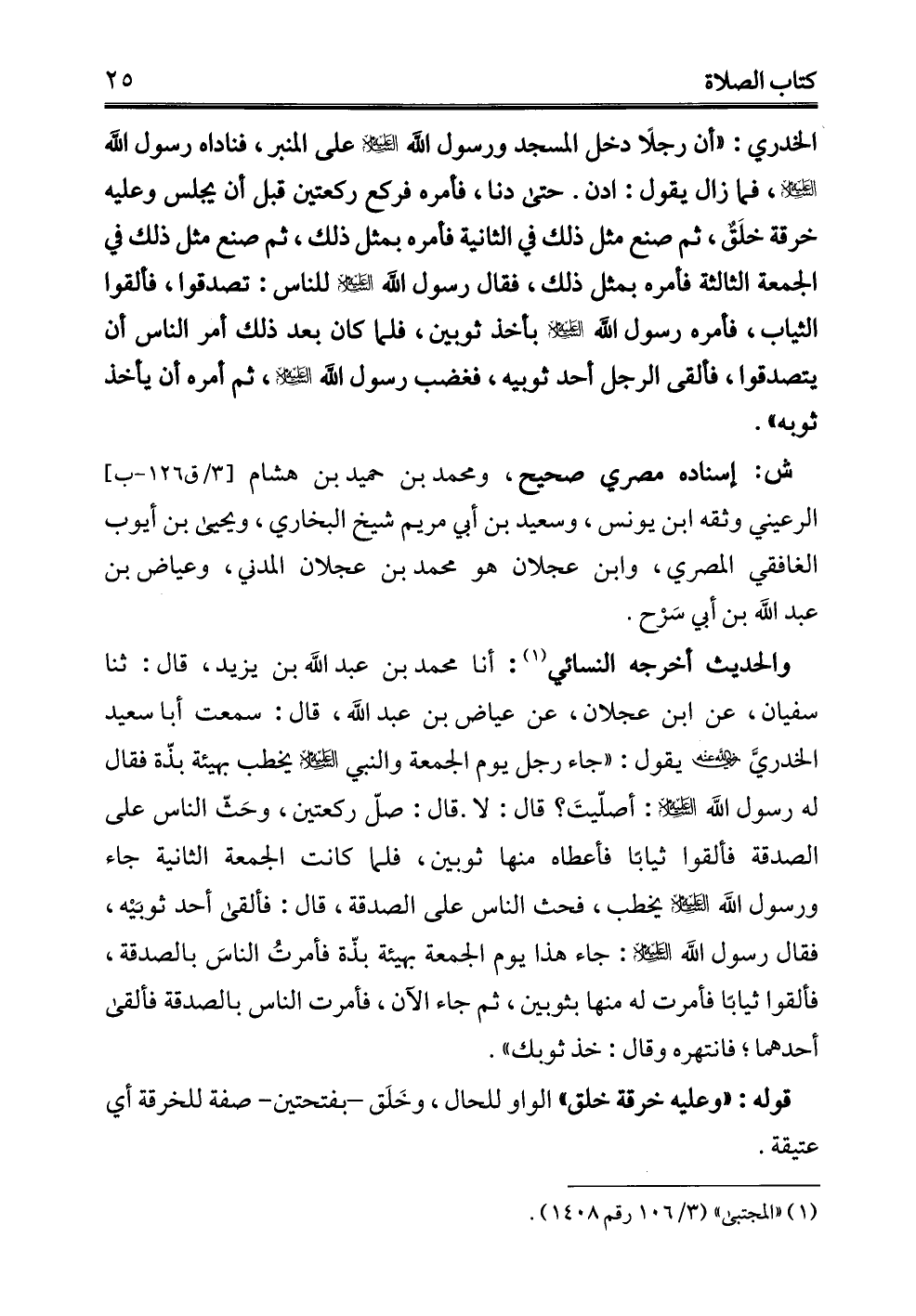 الخدري: "أن رجلًا دخل المسجد ورسول الله - عليه السلام - على المنبر، فناداه رسول الله - عليه السلام -، فما زال يقول: ادن. حتى دنا، فأمره فركع ركعتين قبل أن يجلس وعليه خرقة خلَقٌ، ثم صنع مثل ذلك في الثانية فأمره بمثل ذلك، ثم صنع مثل ذلك في الجمعة الثالثة فأمره بمثل ذلك، فقال رسول الله - عليه السلام - للناس: تصدقوا، فألقوا الثياب، فأمره رسول الله - عليه السلام - بأخذ ثوبين، فلما كان بعد ذلك أمر الناس أن يتصدقوا، فألقى الرجل أحد ثوبيه، فغضب رسول الله - عليه السلام -، ثم أمره أن يأخذ ثوبه".