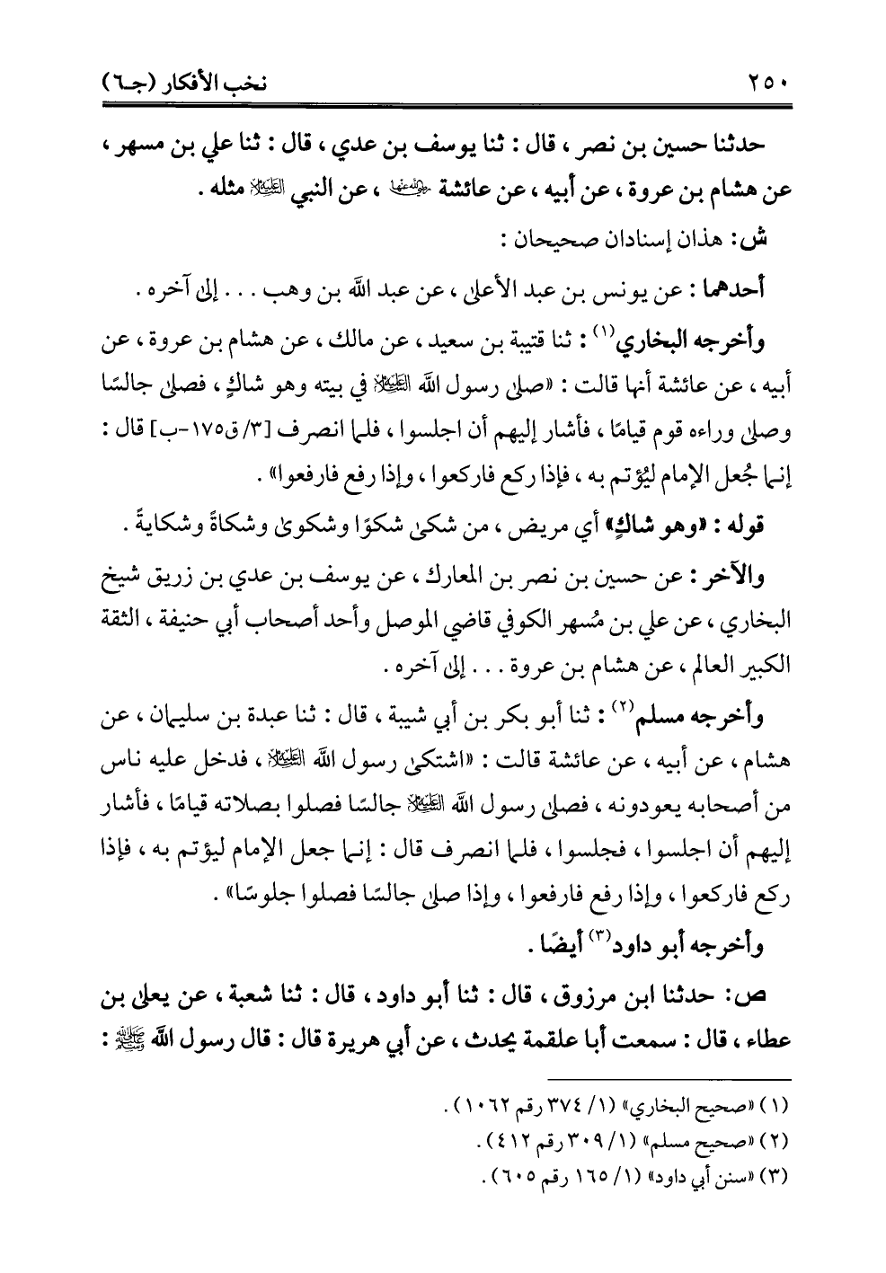 وأخرجه مسلم (¬2): ثنا أبو بكر بن أبي شيبة، قال: ثنا عبدة بن سليمان، عن هشام، عن أبيه، عن عائشة قالت: "اشتكى رسول الله - عليه السلام -، فدخل عليه ناس من أصحابه يعودونه، فصلى رسول الله - عليه السلام - جالسًا فصلوا بصلاته قيامًا، فأشار