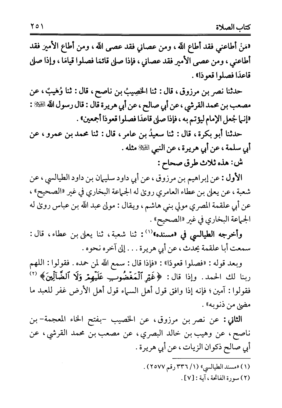 حدثنا نصر بن مرزوق، قال: ثنا الخَصِيبُ بن ناصح، قال: ثنا وُهَيبٌ، عن مصعب بن محمد القرشي، عن أبي صالح، عن أبي هريرة قال: قال رسول الله - عليه السلام -: "إنما جُعل الإمام ليؤتم به، فإذا صلى قاعدًا فصلوا قعودًا أجمعين".