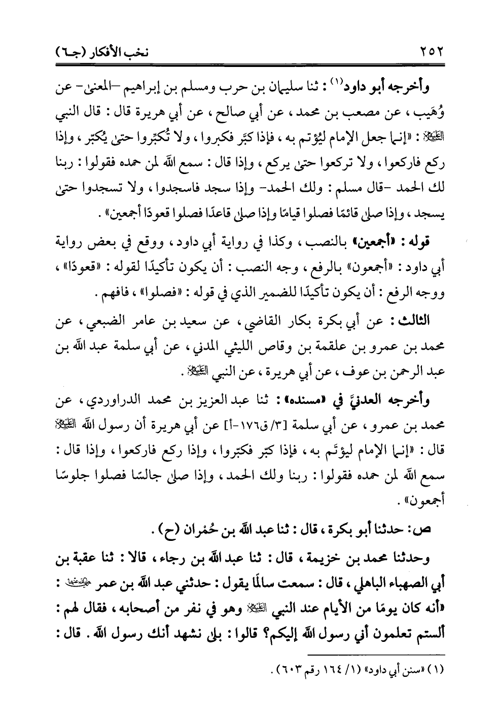 وأخرجه أبو داود (¬1): ثنا سليمان بن حرب ومسلم بن إبراهيم -المعنى- عن وُهَيب، عن مصعب بن محمد، عن أبي صالح، عن أبي هريرة قال: قال النبي - عليه السلام -: "إنما جعل الإِمام ليُؤتم به، فإذا كبَّر فكبروا، ولا تُكبِّروا حتى يُكبّر، وإذا ركع فاركعوا، ولا تركعوا حتى يركع، وإذا قال: سمع الله لمن حمده فقولوا: ربنا لك الحمد -قال مسلم: ولك الحمد- وإذا سجد فاسجدوا، ولا تسجدوا حتى يسجد، وإذا صلى قائمًا فصلوا قيامًا وإذا صلى قاعدًا فصلوا قعودًا أجمعين".