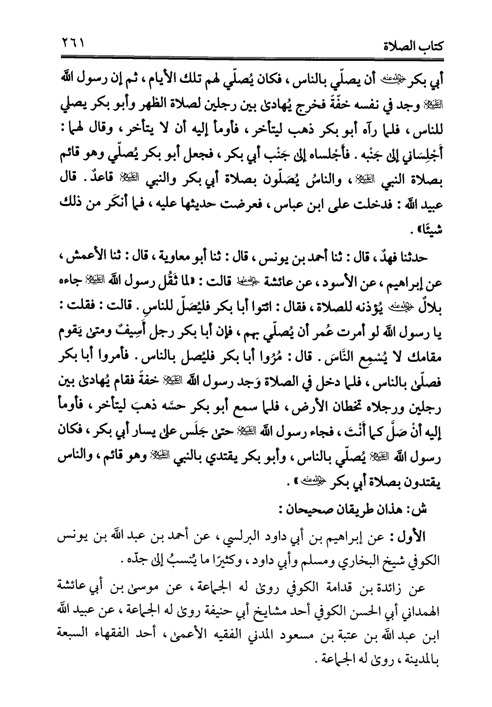 حدثنا فهدٌ، قال: ثنا أحمد بن يونس، قال: ثنا أبو معاوية، قال: ثنا الأعمش، عن إبراهيم، عن الأسود، عن عائشة - رضي الله عنها - قالت: "لما ثَقُل رسول الله - عليه السلام - جاءه بلالٌ - رضي الله عنه - يُؤذنه للصلاة، فقال: ائتوا أبا بكر فليُصَلّ للناس. قالت: فقلت: يا رسول الله لو أمرت عُمر أن يُصلّي بهم، فإن أبا بكر رجل أَسيفٌ ومتى يَقوم مقامك لا يُسْمِع النَّاسَ. قال: مُرُوا أبا بكر فليُصل بالناس. فأمروا أبا بكر فصلّى بالناس، فلما دخل في الصلاة وَجد رسول الله - عليه السلام - خفة فقام يُهادى بين رجلين ورجلاه تخطان الأرض، فلما سمع أبو بكر حسَّه ذهبَ ليتأخر، فأومأ إليه أنْ صَلَّ كما أَنْتَ، فجاء رسول الله - عليه السلام - حتى جَلَس على يسار أبي بكر، فكان رسول الله - عليه السلام - يُصلّي بالناس، وأبو بكر يقتدي بالنبي - عليه السلام - وهو قائم، والناس يقتدون بصلاة أبي بكر - رضي الله عنه -".