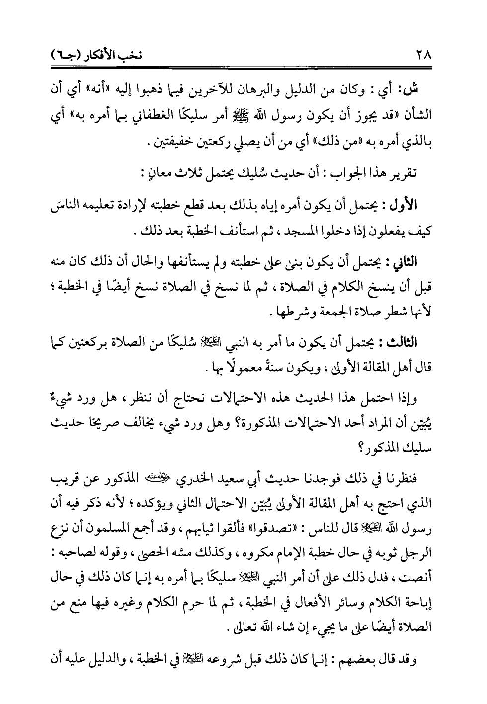 فنظرنا في ذلك فوجدنا حديث أبي سعيد الخدري - رضي الله عنه - المذكور عن قريب الذي احتج به أهل المقالة الأولى يبيّن الاحتمال الثاني ويؤكده؛ لأنه ذكر فيه أن رسول الله - عليه السلام - قال للناس: "تصدقوا" فألقوا ثيابهم، وقد أجمع المسلمون أن نزع الرجل ثوبه في حال خطبة الإِمام مكروه، وكذلك مسَّه الحصى، وقوله لصاحبه: أنصت، فدل ذلك على أن أمر النبي - عليه السلام - سليكًا بما أمره به إنما كان ذلك في حال إباحة الكلام وسائر الأفعال في الخطبة، ثم لما حرم الكلام وغيره فيها منع من الصلاة أيضًا على ما يجيء إن شاء الله تعالى.